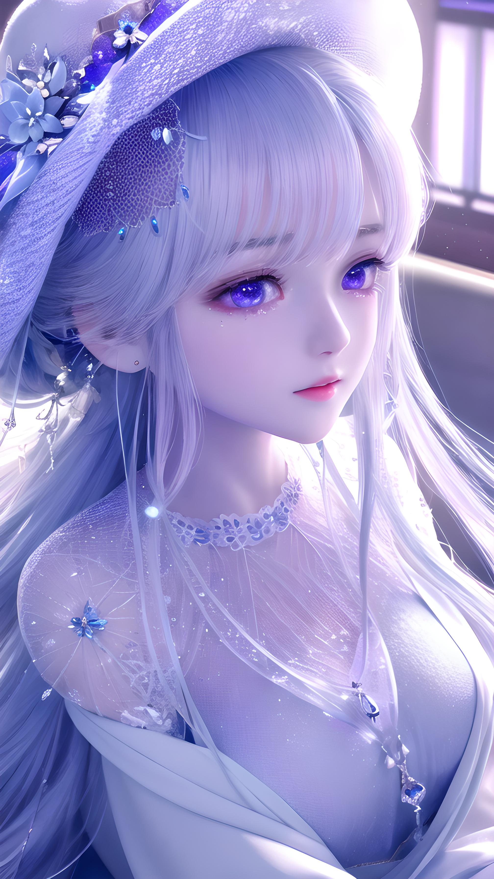 极其精致可爱美丽的萝莉 淡淡妆 柔顺的白头发 戴着蓝紫针织帽 超白的皮肤 大大的眼睛 忧郁的眼神 伤心的流着泪 梦幻水晶灰蓝紫灯泡背景 近身照 侧脸上有血珠