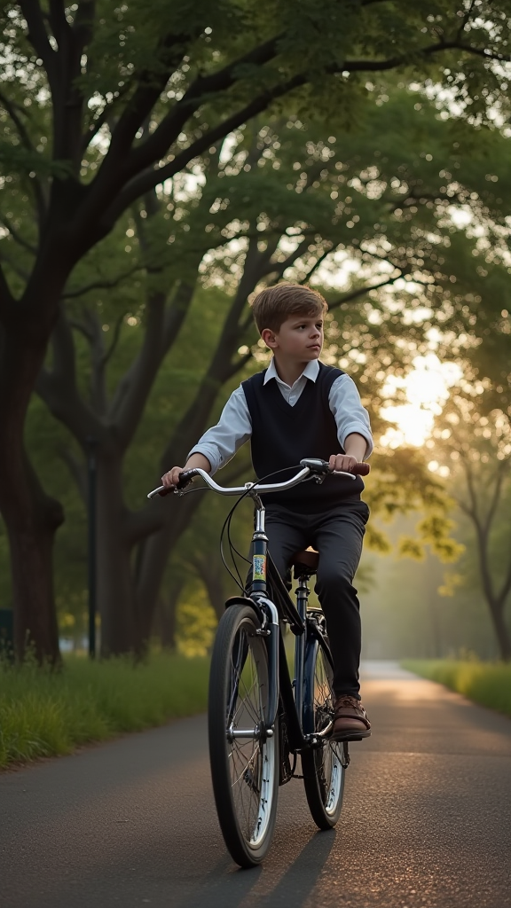 Cinematic wide shot, young boy age 12 wearing school uniform, riding a vintage bicycle on a tree-lined country road, morning golden hour sunlight filtering through leaves, gentle motion blur on wheels, low angle tracking shot, shallow depth of field, photorealistic, 8K quality --ar 16:9