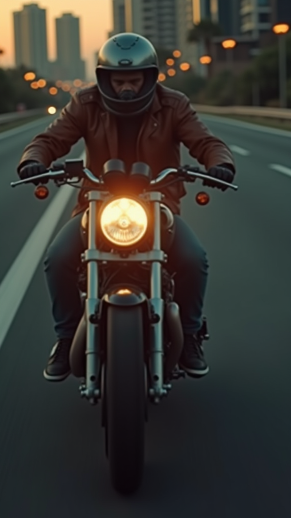 夕阳的金色光芒在头盔和车身金属部件上反射流动
