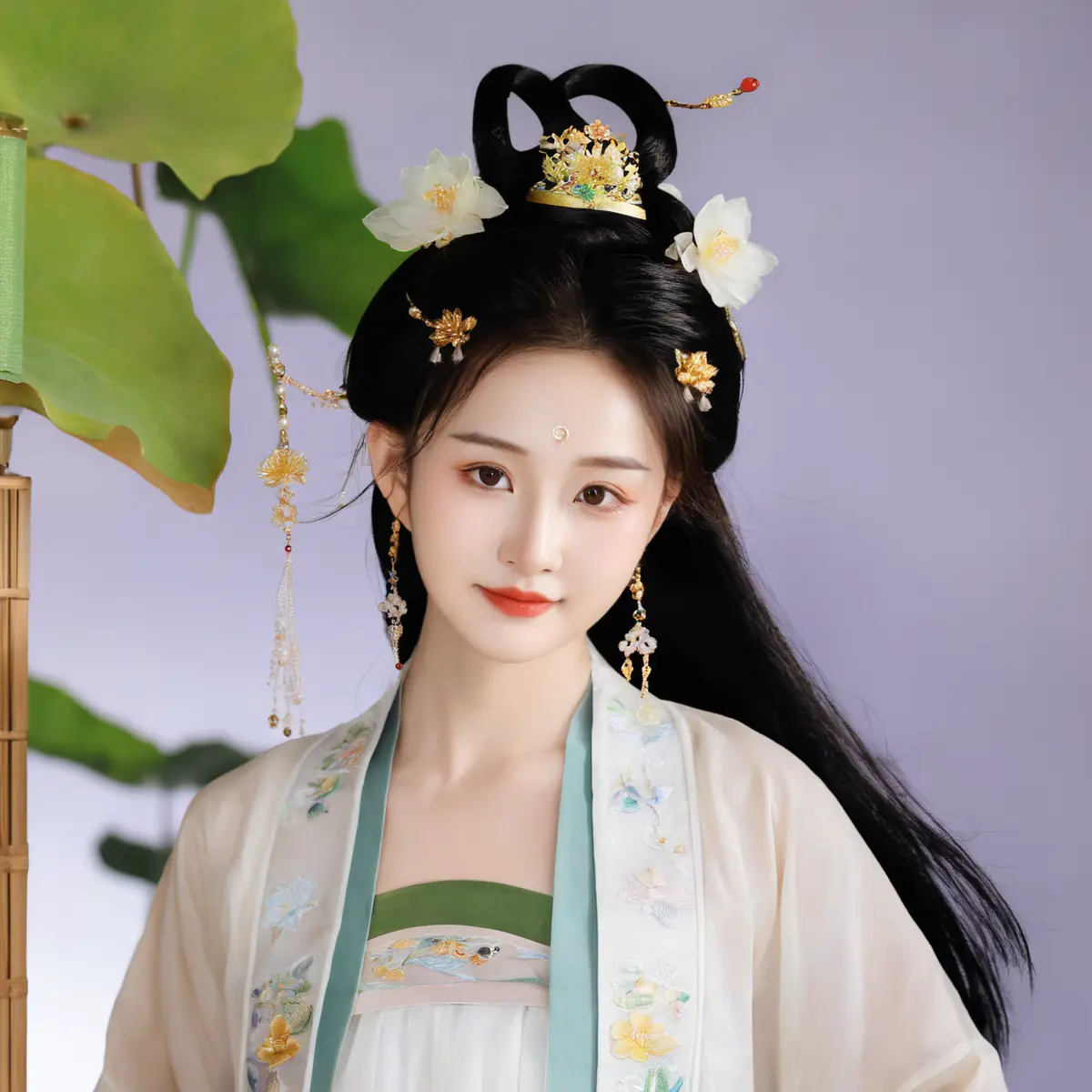 她的打扮素净雅致,全然贴合温和知性的气质,却处处透着低调贵气。常着月白、雾灰、藕荷等浅淡柔色的衣裙,料子多是软缎、暗花罗,垂感极佳,剪裁合体却不紧绷,行走时衣袂轻扬,尽显柔婉。领口多为斜襟小袖,裙摆及踝,稳重不拖沓,鞋面仅隐有兰草、卷云般的极淡暗纹,无多余繁饰,天凉时便搭一件素色轻软披风,更添温润。发间只簪一支素玉簪或木簪,偶配小朵珍珠、玉坠花饰,梳得整齐利落,不蓬松杂乱,耳饰是小巧珍珠或玉坠,腕间戴一只素玉镯,简约不张扬,从头到脚不见大红大绿、珠翠满头,也无花哨艳饰,清淡的模样里,藏着料子与剪裁的上乘质感,尽显“不张扬却贵重”的格调。