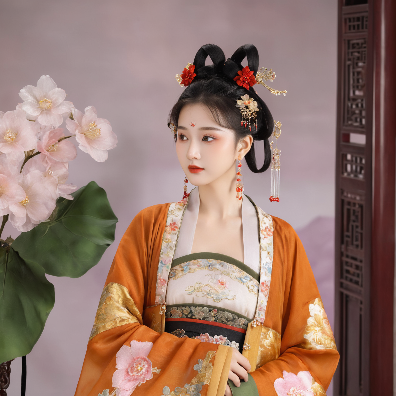 这是一张东方古典女性的侧身近景照,人物身着华丽的唐风服饰,妆容精致,尽显雍容华贵的气质。她的乌黑长发被一丝不苟地盘成繁复的高髻,发髻上点缀着饱满的绢花:深红、粉紫、浅粉的花朵层层叠叠,搭配一枚镂空鎏金的球形冠饰,金饰上的细密纹路与绢花的柔媚质感相互映衬,尽显华贵。几缕纤细的米白色流苏从发间垂落,末端缀着小巧的金色坠饰与红色珠串,随动作轻轻摇曳,增添了灵动的韵律感。她的面容白皙细腻,眉眼修长,眼尾微微上扬,一双浅棕眼眸平静地望向侧方,眼神温婉而沉静。额间贴着精致的白色珍珠花钿,右侧脸颊垂落着一串细碎的珍珠泪饰,从眼下延伸至下颌,与耳间垂落的长坠耳饰(银链串着珍珠与金珠)遥相呼应,将古典妆造的精致感拉满。唇上涂着饱满的正红色唇脂,唇线清晰,更衬得面色明艳。身上穿着一件正红色的大袖外衫,衣料厚实挺括,肩部与领口处绣着繁复的金色缠枝花卉纹样,针脚细密,光泽华贵。外衫内搭层次分明:最内层是绣有暗纹的朱红里衣,中间是翠绿的镶边,最外层露出米白色的宽袖与袖口处的织金纹样,色彩对比鲜明却和谐。颈间叠戴了数层珍珠项链,长短错落,有的缀着玉石、金饰与铃铛,有的则是纯粹的珍珠串,层层叠叠垂至腰间,与腰间系着的橙黄色蝴蝶结腰带相得益彰,尽显唐代贵族女子的丰腴与雍容。背景是纯净的浅粉色墙面,光线柔和均匀,没有多余的杂物,让人物的服饰与妆容细节更加突出,整体氛围庄重而温婉,仿佛从千年之前的盛唐画卷中缓缓走出的仕女,带着时光沉淀的典雅与从容。