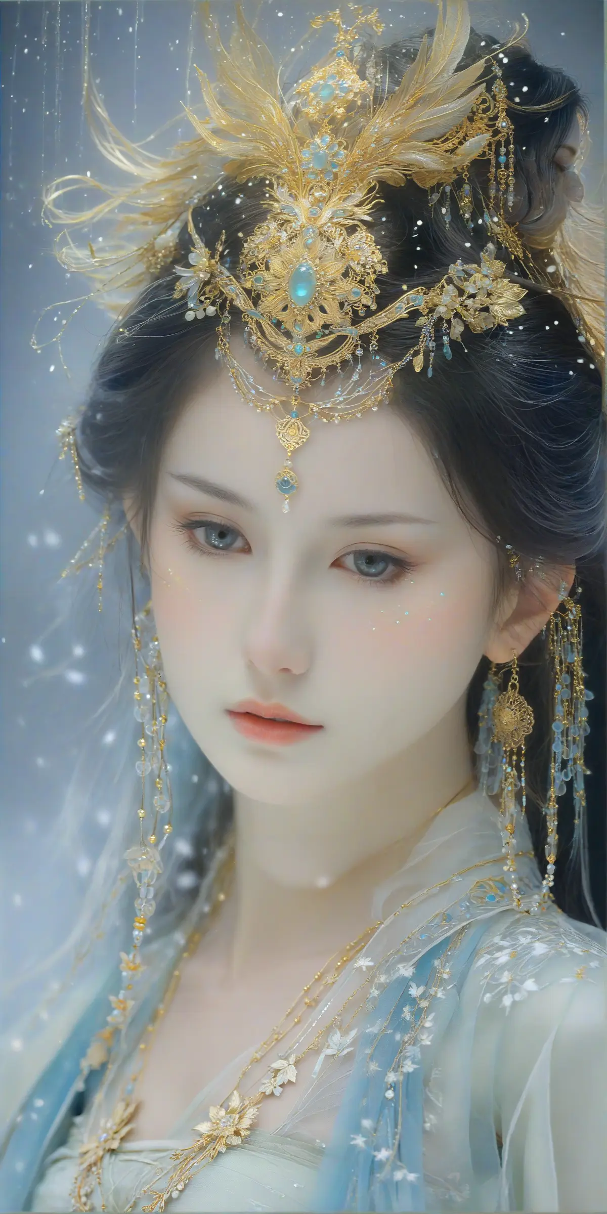 那面具是用极薄的赤金与银丝绞缠而成,云纹卷着细碎的珠玉,从鬓角蜿蜒至下颌,像极了天宫里不慎坠落的星轨,却偏偏只覆住了她右颊的伤痕。每一道纹路都藏着刻意的温柔,试图遮掩那场撕裂仙容的痛楚,可越是精致,越衬得那露在外面的眼睫冷得像冰。