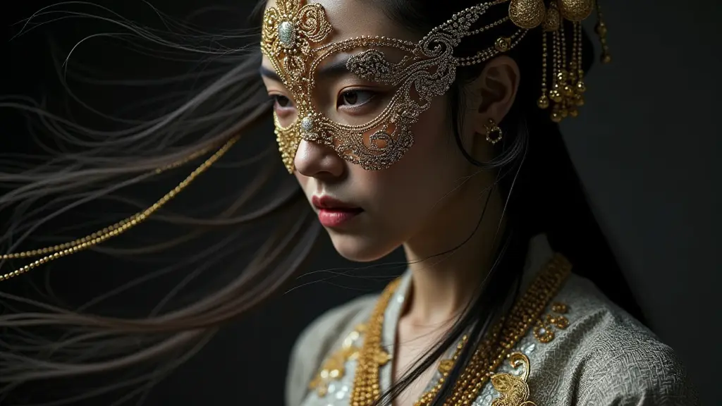 她立在廊下,半张脸浸在鎏金的光里,另半张藏在精巧的面具之后。