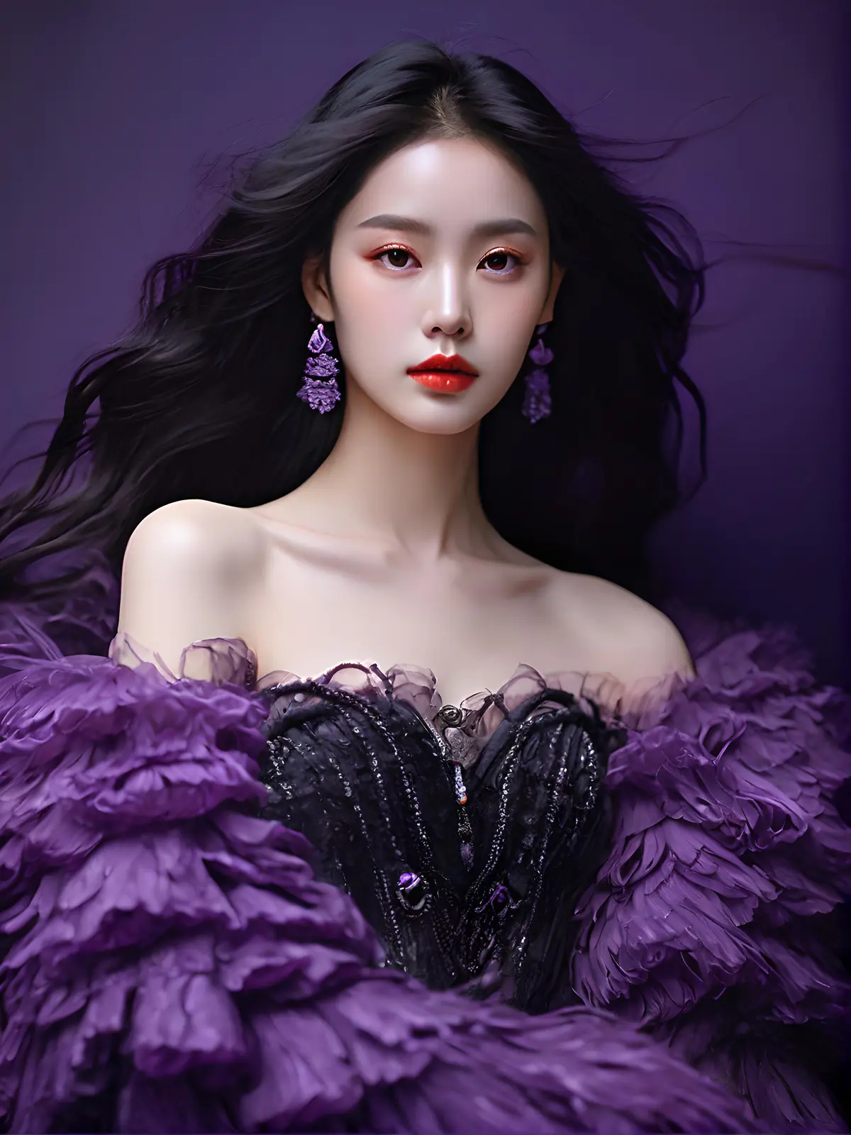 masterpiece, best quality, ultra detailed, 8k, hyper realistic, cinematic lighting, soft focus, depth of field, 1girl, long wavy purple hair, delicate facial features, fair skin, purple eyes, red lips, cold and elegant expression, black off-shoulder ruffled dress, purple crystal tassel earrings, ear cuff, dark black background, low saturation cool tone, mysterious atmosphere, oil painting texture, detailed hair strands, realistic skin texture, intricate clothing details, high contrast, 1:1 square composition, portrait XL model, professional portrait photography, aesthetic, no watermark, no text