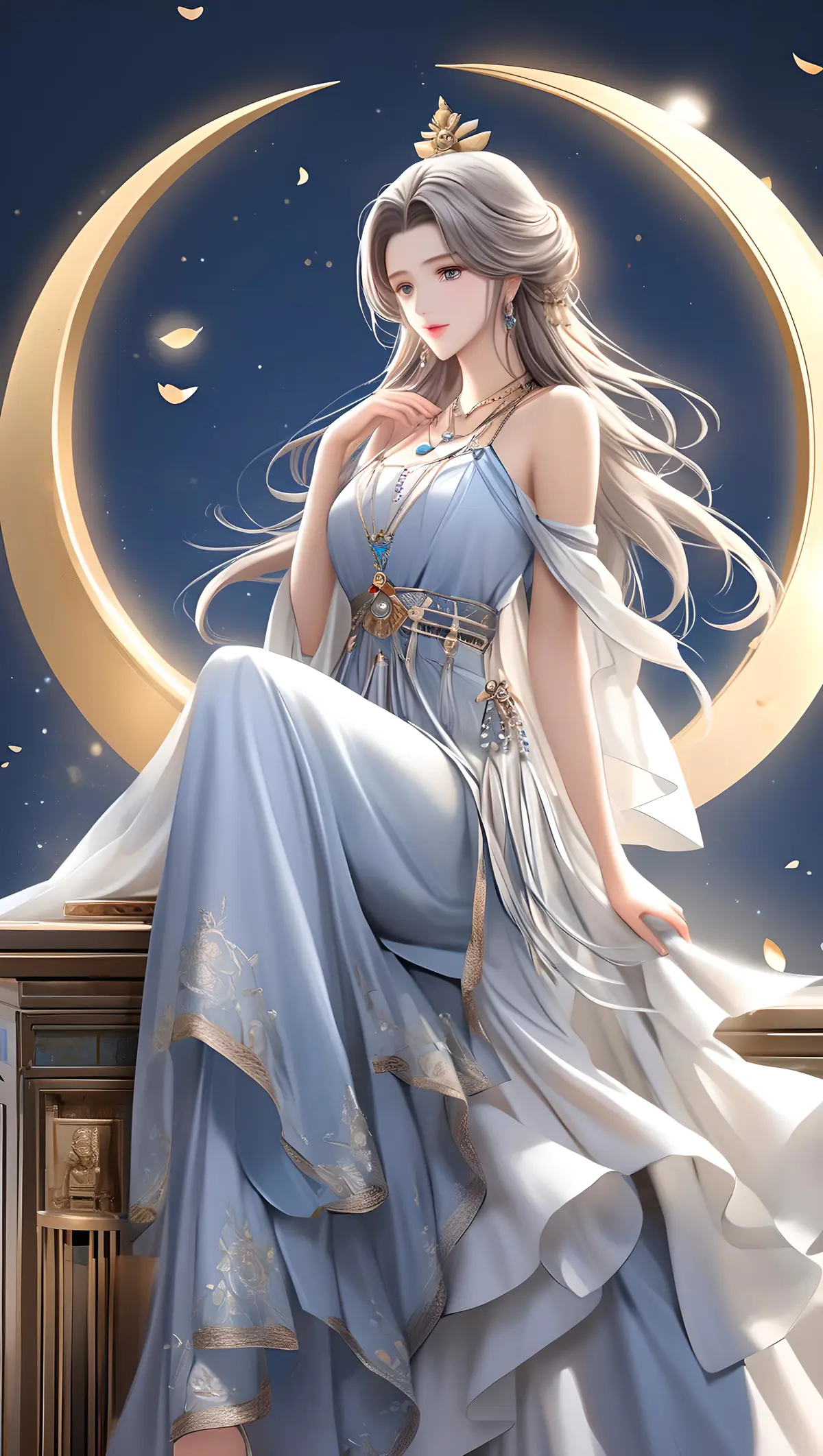 一位古风神女。清冷倾国倾城。古风。女主穿着一身浅蓝色的飘逸的衣裙。仙气飘飘。一张造物主设置出来的都意外的绝美的脸。身高,165体重92,有一头银发。长发及腰。坐在弯月上。修长纤细玲珑的腿。漫画手。身后是一座辉煌气派的神殿。显现的她神圣又亲人。九天神女