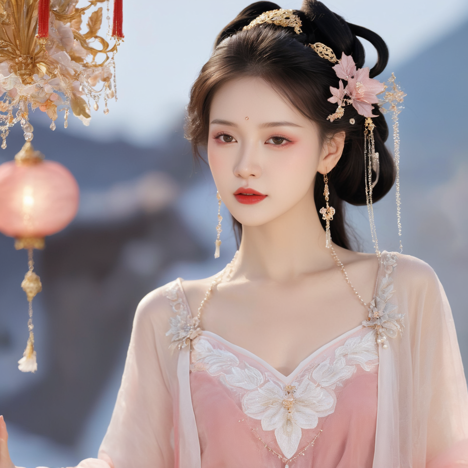 她立于鎏金溢彩的天界殿宇间,鬓发如瀑,仅以几缕碎钻银饰轻绾,衬得颈线纤长利落。一袭月白抹胸裙为底,外覆一层薄如蝉翼的粉烟纱衫,纱裾垂落时似揉碎的云絮,肩头缀着几缕若隐若现的银线暗纹,轻软又添几分雅致。最惹眼的是那抹唇色,如燃着的赤焰,浓艳却不俗气,与周身清浅的粉白色调形成鲜明对照,冷艳中藏着一丝不易察觉的疏离。眉眼间凝着淡淡的清冷,目光沉静,整个人既带着天界仙姝的清逸,又因那抹红唇平添了几分夺目的明艳与疏离感。