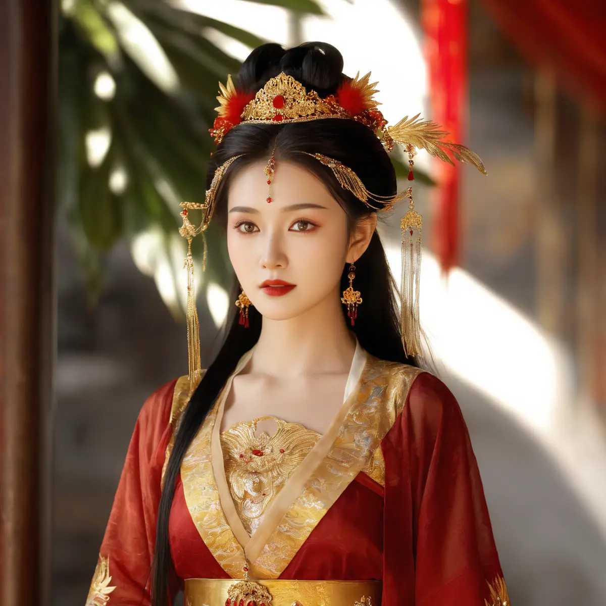 她的脸是古典的鹅蛋轮廓,眉峰微扬,眼尾带着一点恰到好处的上挑,瞳仁亮得像浸在酒里的星子,正侧眸看向身侧,唇角噙着一抹极淡的笑意,却没真正落到眼底。烛火映在她眼里,将那点笑意烘得更柔,却衬得她周身的气度愈发沉敛,像深宫里一汪看似平静的寒潭,底下藏着翻涌的暗流。身后的铜灯架上,烛火明明灭灭,将殿内的雕花墙影拉得忽明忽暗,而她立在这片明暗之间,一身红衣艳得近乎灼眼,偏又带着几分不动声色的威仪,不怒,却自有一股让人不敢直视的震慑力。
