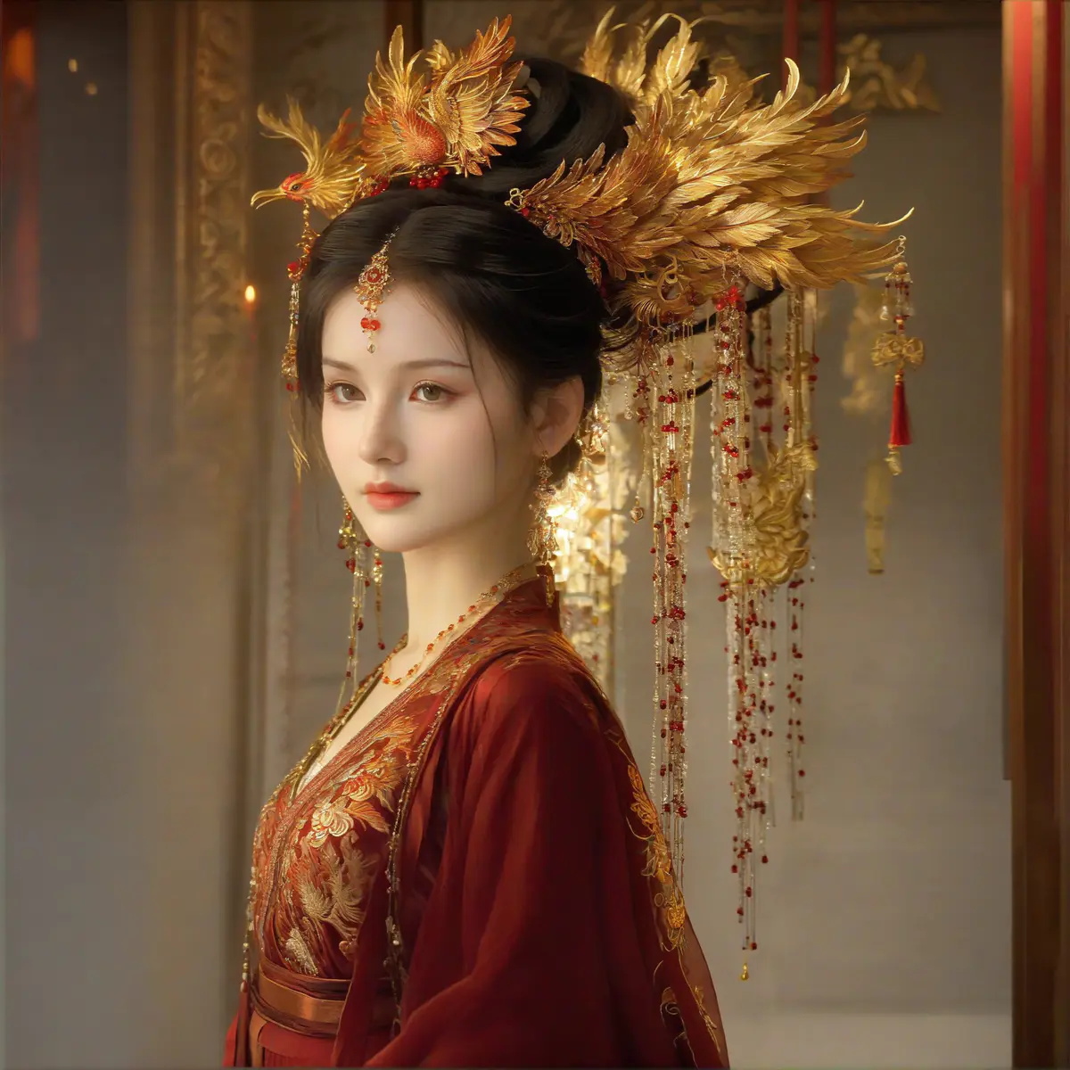 烛火如金屑般泼洒在她周身,将整座大殿的昏沉都烘得暖了几分。她立在其中,一身正红曲裾如烧得正烈的炭火,衣料上用暗金绣着蟠曲的凤纹,针脚细密如织,随着光影流转,仿佛有金羽在衣料间振翅。乌黑的长发高高盘起,头顶那支赤金凤冠最是夺目——双凤交颈,尾羽舒展,凤喙衔着细碎的金饰,鬓边再斜插几支鎏金步摇,垂落的流苏随着她侧首的动作轻晃,在颊边投下细碎的光影。