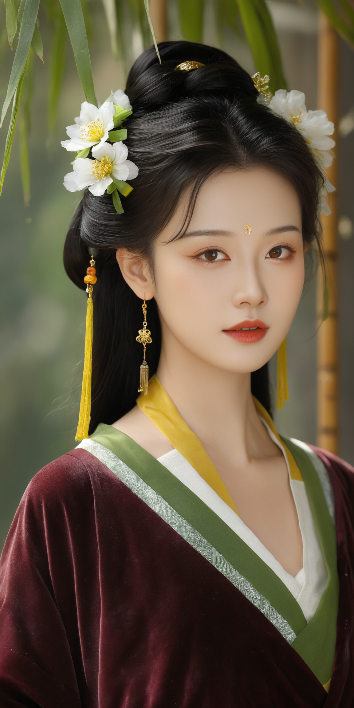 廊下的风卷着檐角残雪的碎光,落在她鬓边那支压着绿黄条纹布巾的木簪上。发间缀着的小朵绒花垂着橙黄流苏,随着她侧首的动作轻晃,将几缕鸦羽般的碎发扫过颊边。她一身素白交领中衣,外罩玄色短褐,布料洗得软而挺括,领口与袖口露出的白边干净利落,腰间束着同色系布带,打了个利落的活结。右手握着一卷竹简,竹片的纹理在指节间硌出浅痕,身侧悬着的短柄器物,绿玉般的握柄在光下泛着温沉的光。日光从她肩侧斜斜铺过来,落在她轮廓分明的下颌线与挺直的鼻梁上,眼尾微微上挑,目光望向身侧的远方,唇线抿得平静,却自有一股清锐的气骨,像寒冬里一株开在檐下的梅,素净,却不肯折半分风骨。彩漫全身图