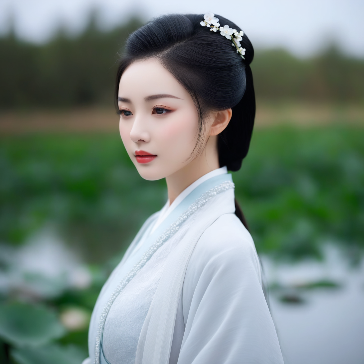 写实风格,一位女子生得极素净,眉目温软,肤色是极浅的瓷白,不施脂粉也清雅通透。眉形细而平,眼型偏长,瞳色沉如寒潭,鼻梁秀挺,唇色偏淡。常着月白霜色长衣,料子垂密,暗纹隐现,发髻极简,只一支素玉簪。垂眸时温顺如春水,抬眼时瞳色沉冷,静立自带端凝压人气度,看似慈悲无害实则深不可测