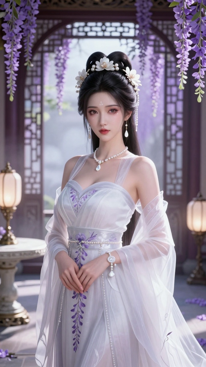 (3d渲染国漫美女:1.5), CG动漫美女, 平视镜头, (极致精致仙女五官:1.4), 远山黛眉, 眼尾带泪痣的水润杏眼, 精致琼鼻, 饱满樱唇, 通透冷白皮, (丰满大胸:1.7), 温婉妩媚神态, 元宝髻, 珍珠发冠, 白玉兰花发簪, 白贝母水滴耳环, 珍珠璎珞, 白玉手链, (月白色薄纱古风长裙:1.3), 带内衬, 裙摆绣紫藤花暗纹, 广袖流仙裙, 轻纱拖尾, 身处古风紫藤花厅室内场景, 拱形雕花落地窗, 满架紫藤花垂落, 白玉圆桌, 珍珠流苏宫灯, 阳光透过花窗洒下丁达尔光, 仙雾缭绕, 8k超清, UE5渲染, 光线追踪, 室内体积光, 电影级光影, 极致细节刻画, 丝滑材质, 高动态范围, 景深