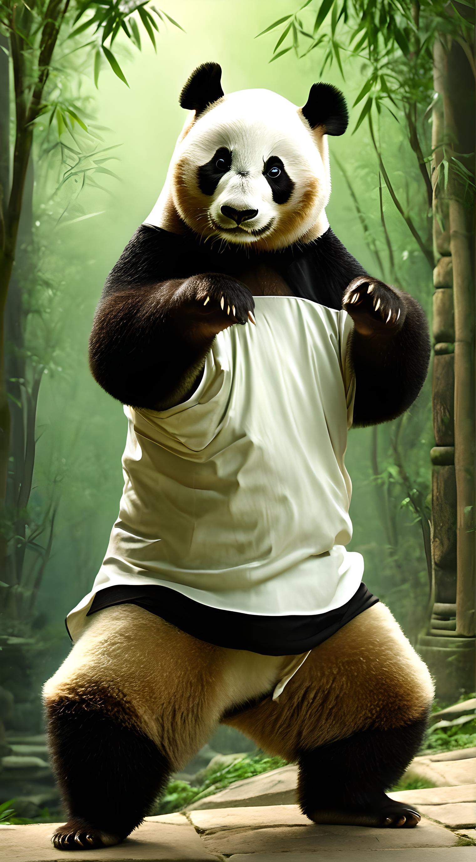 一只穿着青花瓷衣服的熊猫,练太极拳,他动作优美,大开大合,充分展示太极拳的博大精深。超现实,艺术风格插画,禅意,光影交错,古韵白,超宏大的场景,配以流畅的动作,极其细腻的笔触,柔和流畅,干净的背景,3D渲染,超清画质,极致细节。