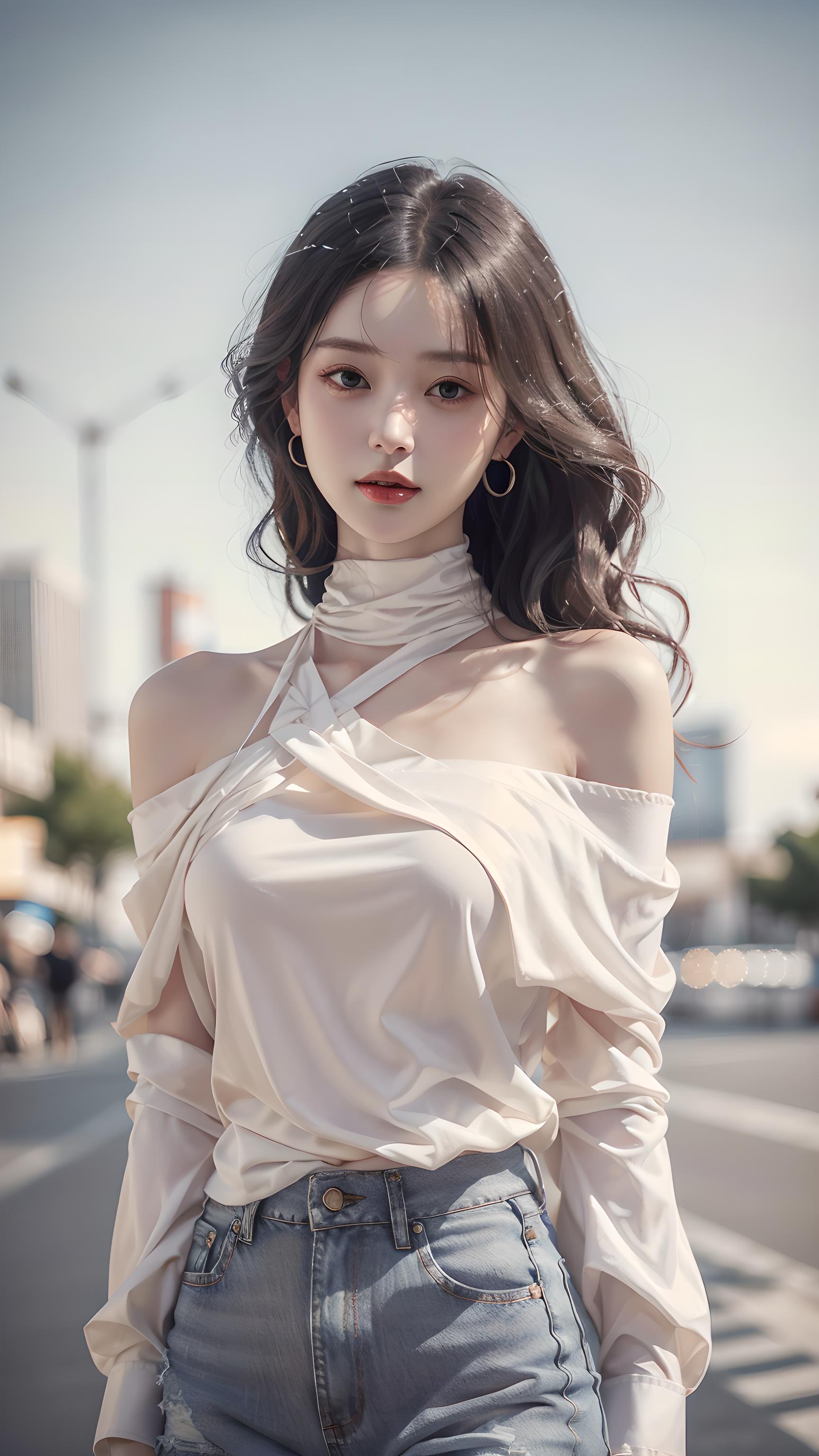 最佳品质,无限细节,最高质量,正面照,漂亮的美少女,柔美,完美比例脸,脸红,大笑,精致的五官,甜美微笑,精致的眼睛,精致的睫毛美丽的眼睛甜美有卧蚕,耳钉,项链,精致的锁骨,长发飘飘,顺滑发丝,((高领露肩衬衫亮晶晶,黑色衬衫紧身牛仔裤:1.3)),包裹感,完美身材,褶皱,细腻的肌肤,不暴露,动态动作,户外,黄昏,田野,景深,大景深,完美细节,极端细节,逼真极致,电影CG渲染,电影光,大师作品,丁达尔效应,北条司的肖像画.超高清,真实,苗条,180,站姿,街拍