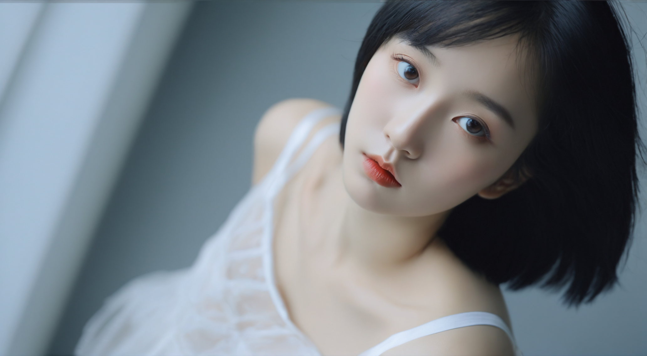 迷人少女,白色的衣服。黑色的头发,短发,明亮的大眼睛,水嫩白皙透亮的皮肤,逼真写实的,精致完整的五官,诱人嘴唇,飘柔顺滑发丝,迷人,极端细节,逼真细节,完美身材,超高清壁纸,超广角拍摄,大师作品,半身照