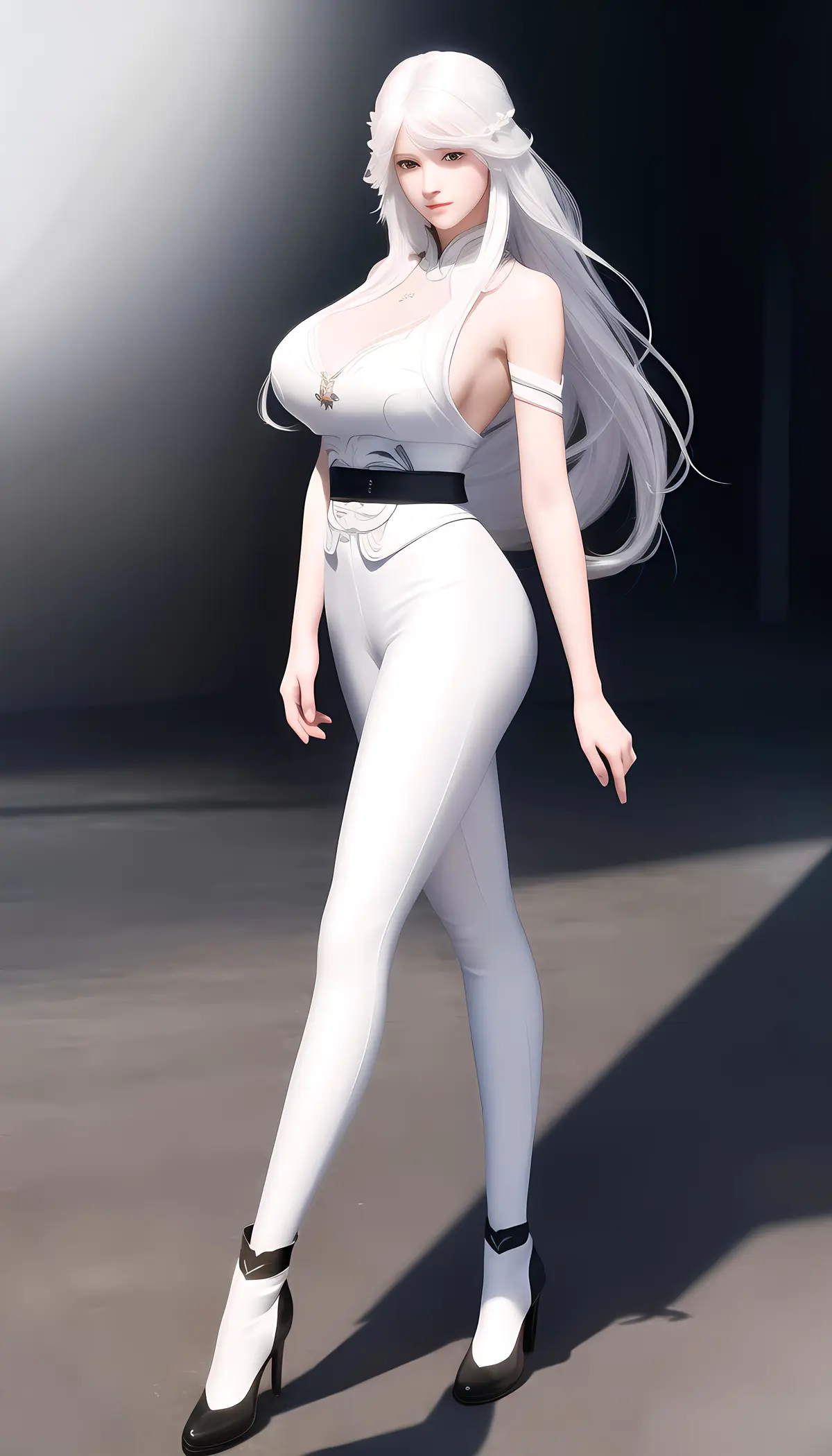 最高品质,杰作,大师之作,极致细节,精致的五官刻画,精致的头发刻画,精致的眼睛刻画,绝世美人,8k画质。绚丽的光影,完美的身材比例,白色长发,模特,御姐,大胸,大长腿,白寸衫,黑皮裤,短靴,走在马路上