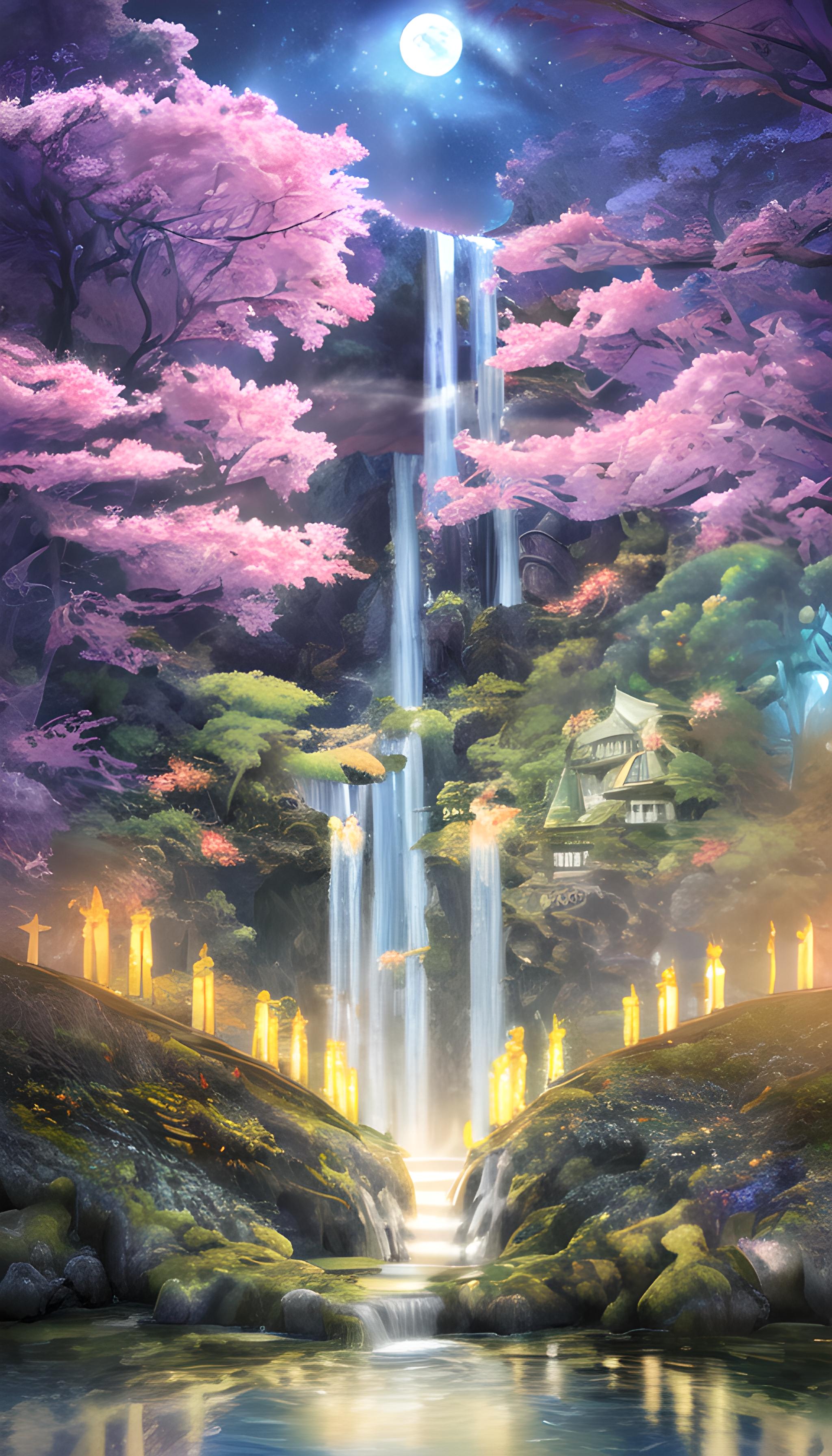 极端细节、电影照明真实感,超广角,清晰、通透、没有雾气。七彩的北极光,满天晚霞、黄色的月亮、大大的月亮,天空中有许多各种颜色的云、红色樱花、粉色樱花、黄色叶子银杏树,绿色叶子枫树,正面照亮,远山,仙山群楼 ,亭台楼阁、背景瀑布,美丽、超详细、充满活力、幻想、艺术、电影、照明、数字艺术、8k极致细致,真实感极强,正面光明亮,清晰,底色明亮,动态照明、超详细、复杂、细节、8k,超细节、超现实、照片真实感、摄影术超细节、超现实、照片真实感、明快、锐利。