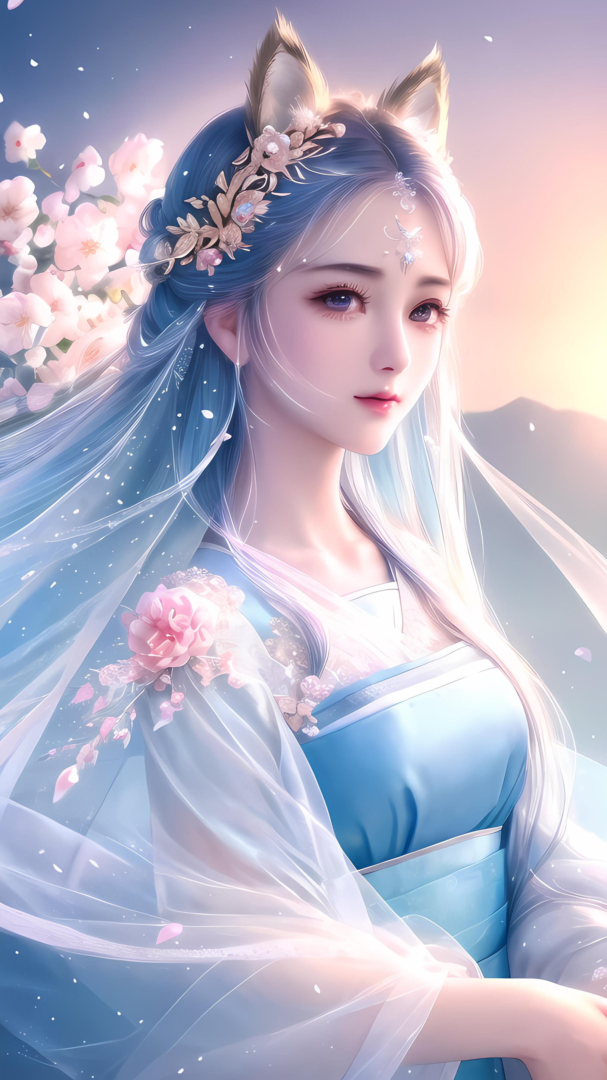 可爱的漂亮女生,(逼真)白色狐狸耳朵,大眼睛,汉服,飞舞的花瓣,插图,(逼真),羽毛散落,闪光粒子,正面,电影角度,反光头发,水汪汪眼睛,看着你,面部细节,面部聚焦,(杰作),(最好的质量),(插图),(极其精致和美丽),(动态角度),水晶元素,(复杂的细节)(美丽和精致的眼睛),精致的脸,头上的装饰,(可爱),焦点,线条清晰,魔法特效,高分辨率,好看一点,微笑,衣服浅蓝色的(写实)