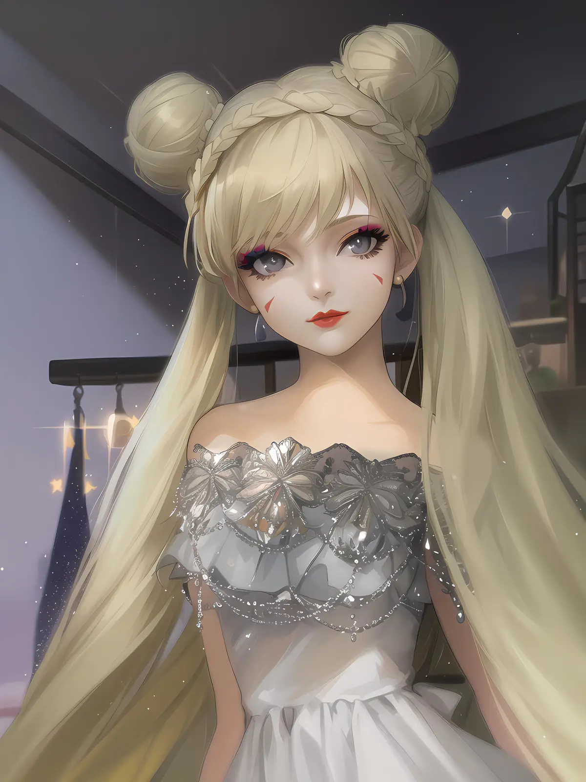 1girl,bare_shoulders,black_eyes,blonde_hair,crescent_facial_mark,double_bun,dress,eyelashes,facial_mark,grey_eyes,lips,long_hair,looking_at_viewer,makeup,photo_(medium),realistic,red_lips,solo,strapless,strapless_dress,twintails,upper_body,princess_serenity,tsukino_usagi,rating:safe