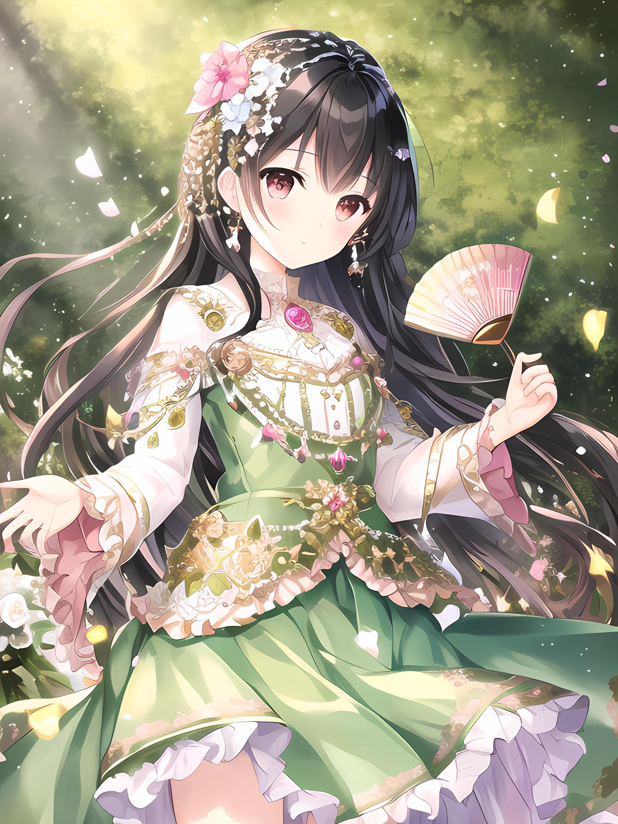 穿着精美华丽的{{{浅绿色的裙子}}}