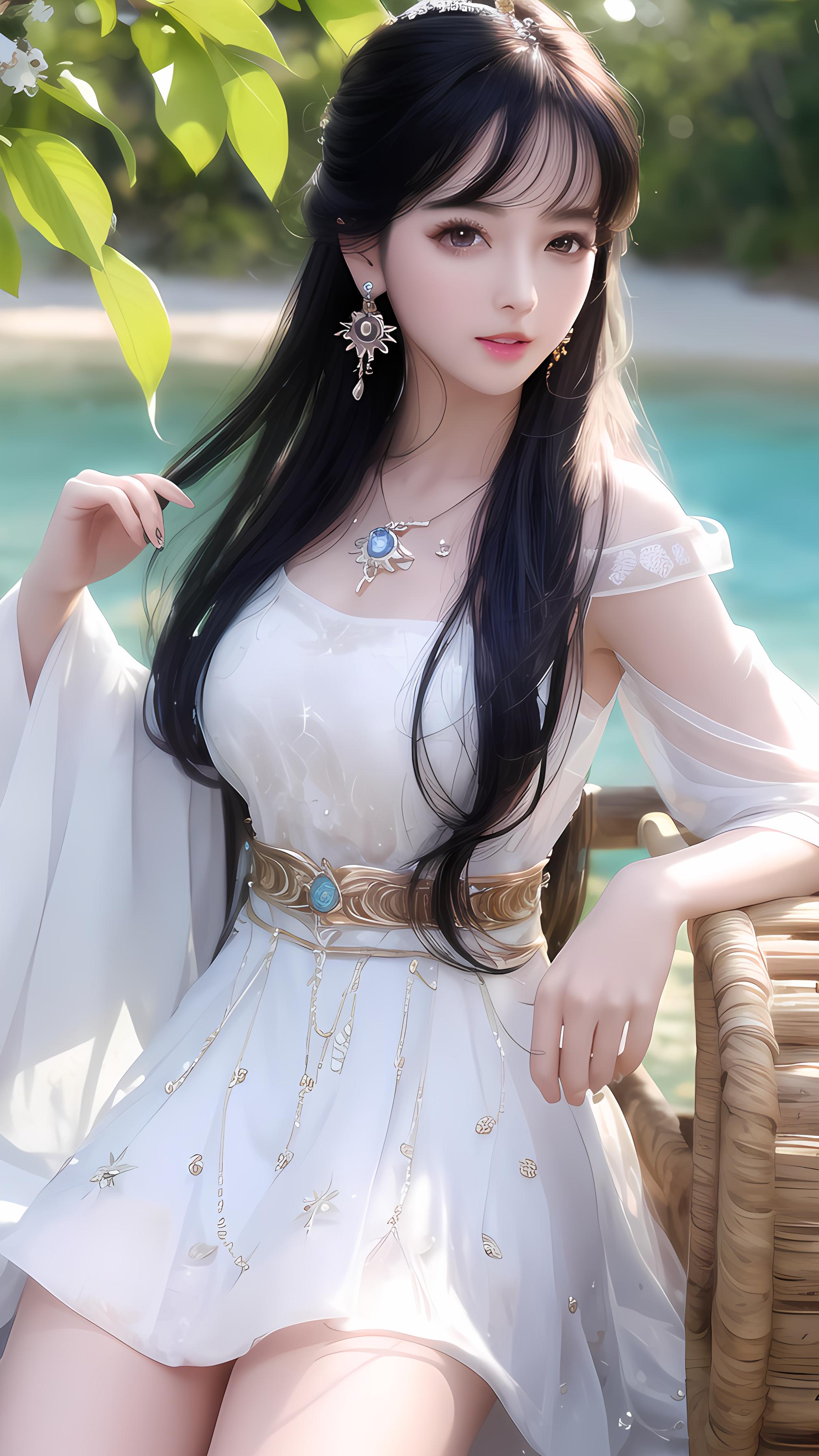 最好画质,更高质量,太阳光,极高细节,中长头发,乌黑头发,超高分辨率,皮肤白皙,超白皮肤,8k分辨率,斜刘海,夏天,口红,靠近观者,漏齿笑,可爱的女孩,在海边沙滩,高细节,微距镜头,熟女,单人,微笑,景深,女神,脸红,黑色吊带,黑色铅笔裙,黑色蕾丝,露肚子,面向观者,眼影,吊坠,耳环,睫毛,大眼睛,眼睛特写,脸部特写,嘴唇特写