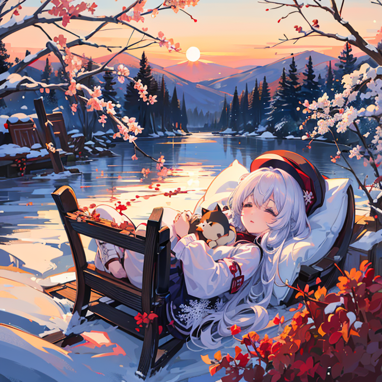 抱着一只睡着的小狐狸看夕阳
