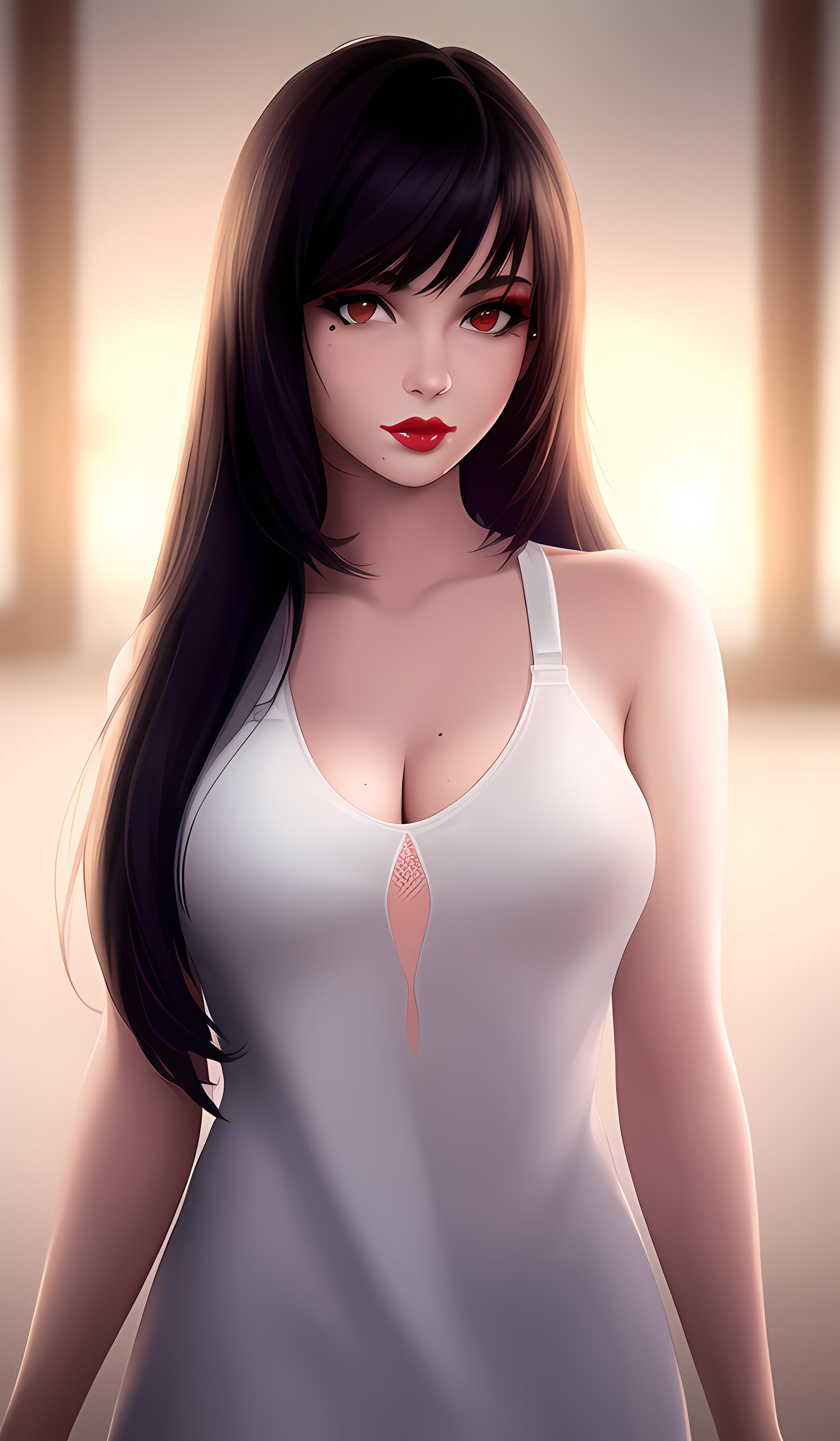 1girl,black_hair,breasts,brown_eyes,camisole,cleavage,collarbone,dress,indoors,lips,lipstick,long_hair,looking_at_viewer,makeup,medium_breasts,mole,mole_on_breast,mole_under_eye,nose,realistic,red_lips,sleeveless,solo,tank_top,taut_clothes,taut_shirt,upper_body,white_dress,white_tank_top,tifa_lockhart,rating:safe