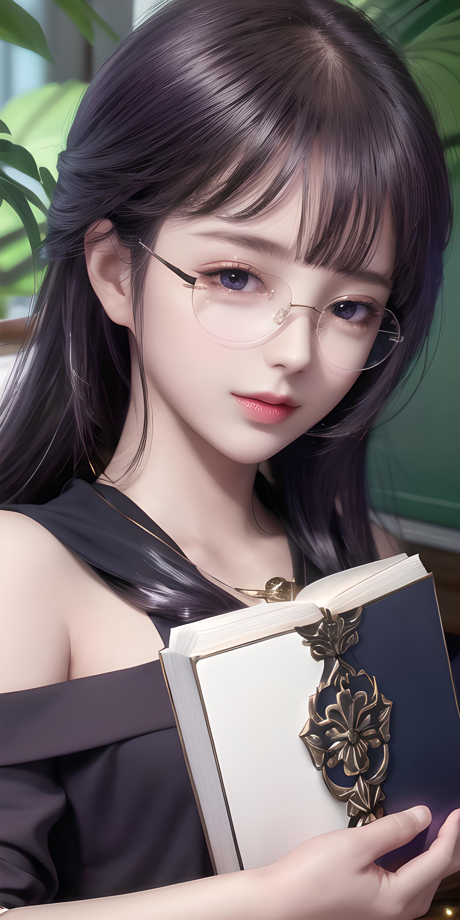 [最好画质],更高质量,高细节,夜晚,超高分辨率,8k分辨率,大师作品,照明,高光边美女,景深,教室里,黑板,书桌,抱着书本,上半身近距离,超白反光皮肤,紫色渐变光泽亮头头发女孩,吊坠,戴眼镜,油润光泽的嘴唇,眼影,露肩