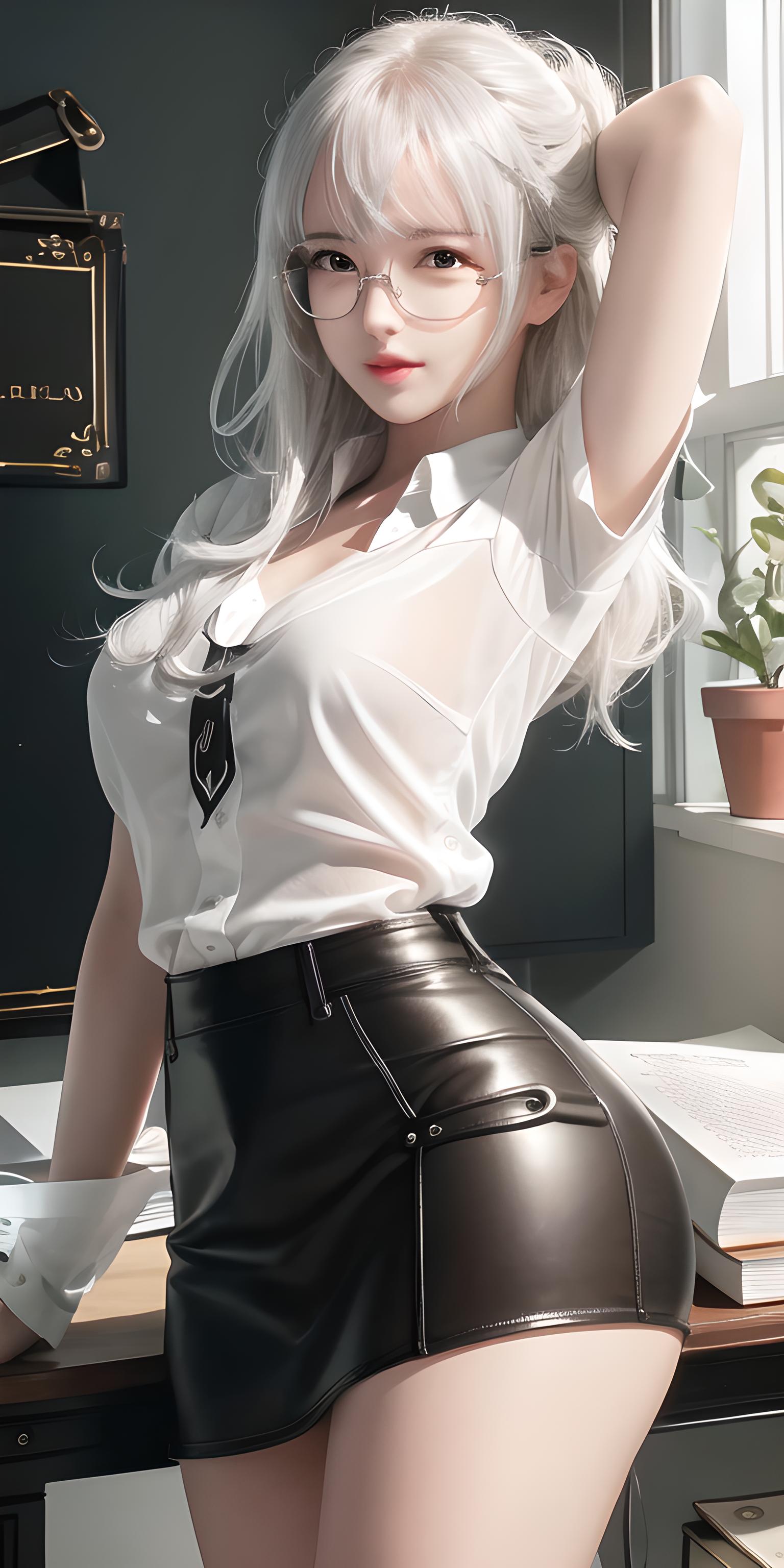 [最好画质],更高质量,高细节,夜晚,超高分辨率,8k分辨率,大师作品,照明,高光边美女,景深,教室里,黑板,书桌,抱着书本,七分身镜头,白色寸衫上身,短裙,反光腿,超白反光皮肤,白色光泽亮头头发女孩,戴眼镜,油润光泽的嘴唇
