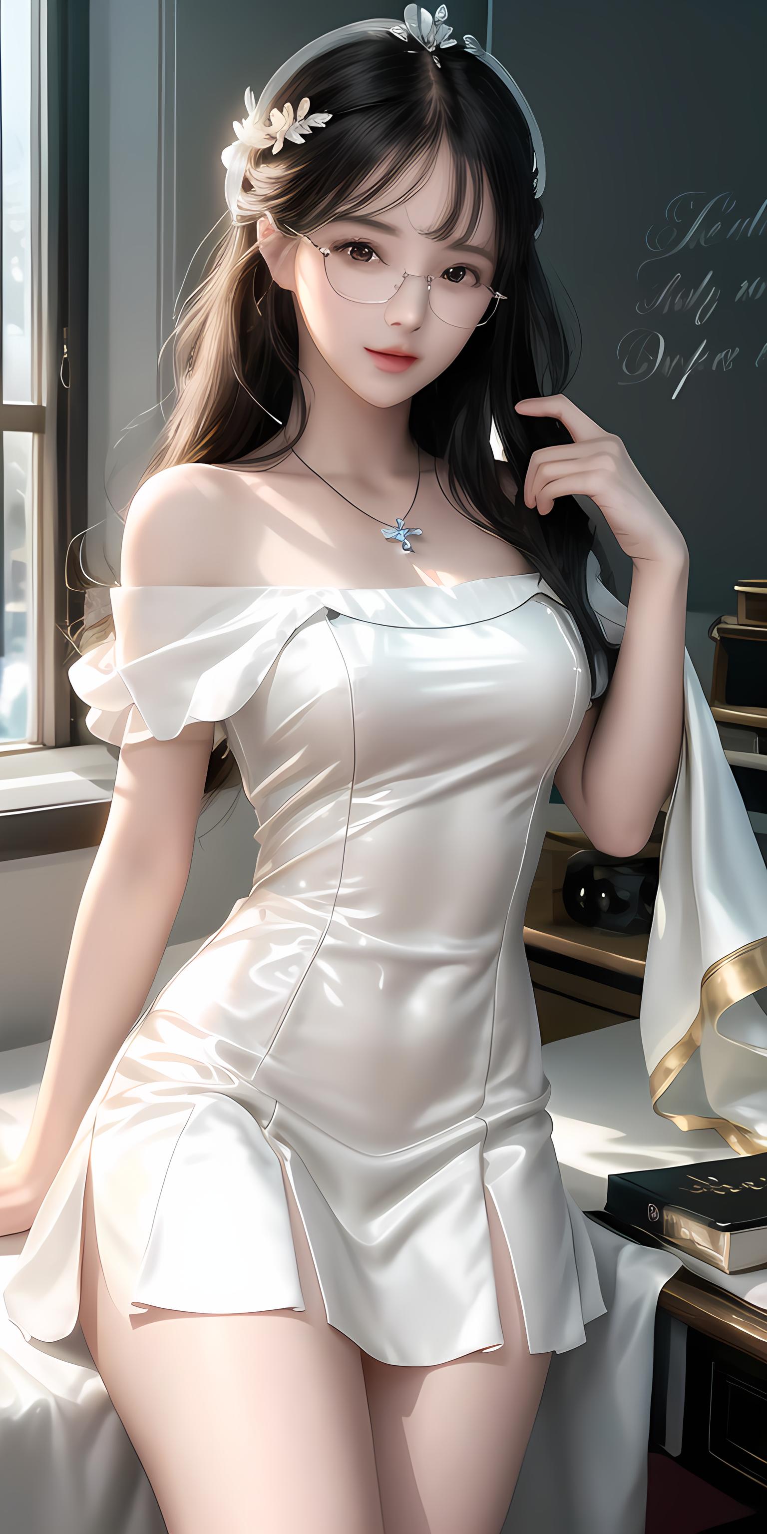 [最好画质],更高质量,高细节,超高分辨率,8k分辨率,大师作品,黑夜的教室,红灯照明,高光边美女,景深,雪白的皮肤,书桌,抱着书本,上半身近距离,超白反光皮肤,黑色光泽亮头头发女孩,吊坠,短裙,戴眼镜,油润光泽的嘴唇,眼影,露肩