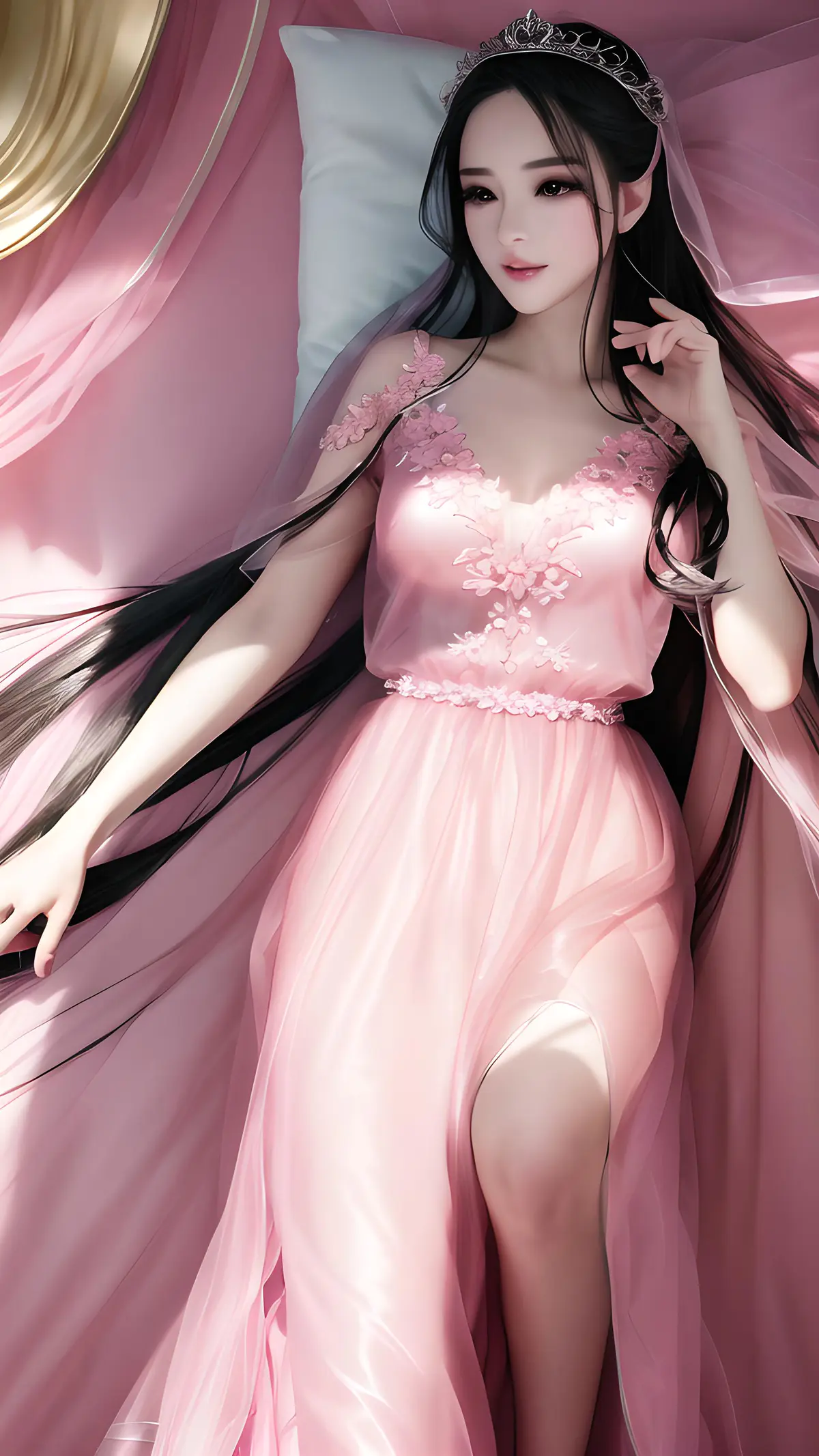 大师作品,最好画质,更高质量,高细节,8k分辨率,美少女,精致的五官,完美的脸,发光皮肤,长睫毛,脸红,黑色长发,((仰卧)),向上看,(((躺))),(((粉红色性感薄纱睡袍))),睡袍班透明 ((床)),窗帘,室内,性感,妩媚,妖娆,成熟,