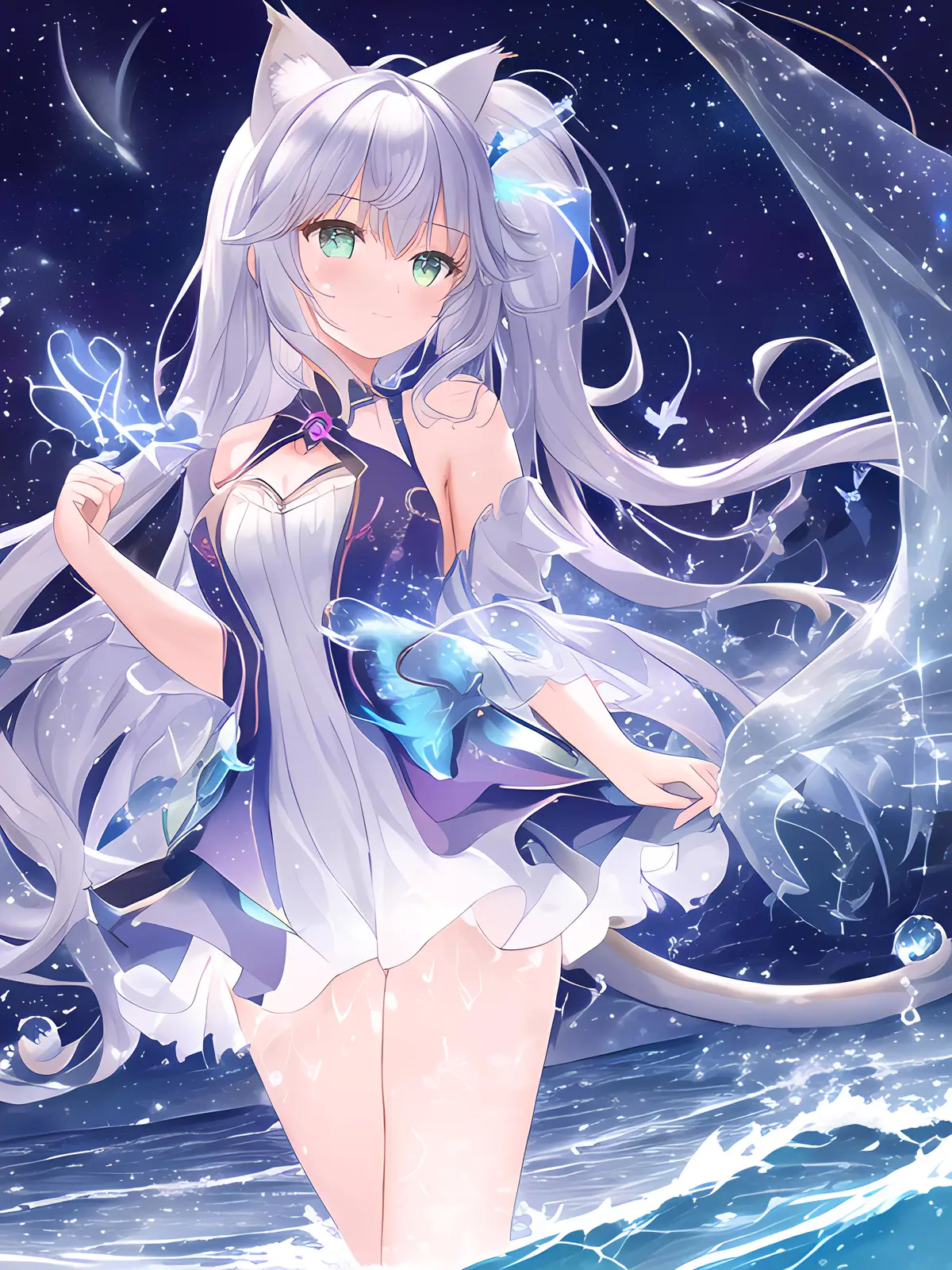 大师作品,最好画质,更高质量,全身镜头,美少女,单人,魔法少女,猫耳朵,水汪汪大眼,脸红,猫尾巴,长发,双马尾,银发,发带,新月发饰,礼服,哥特风格,公主服歪头,躺,落日,梦幻,魔法环,水魔法,沉入星海