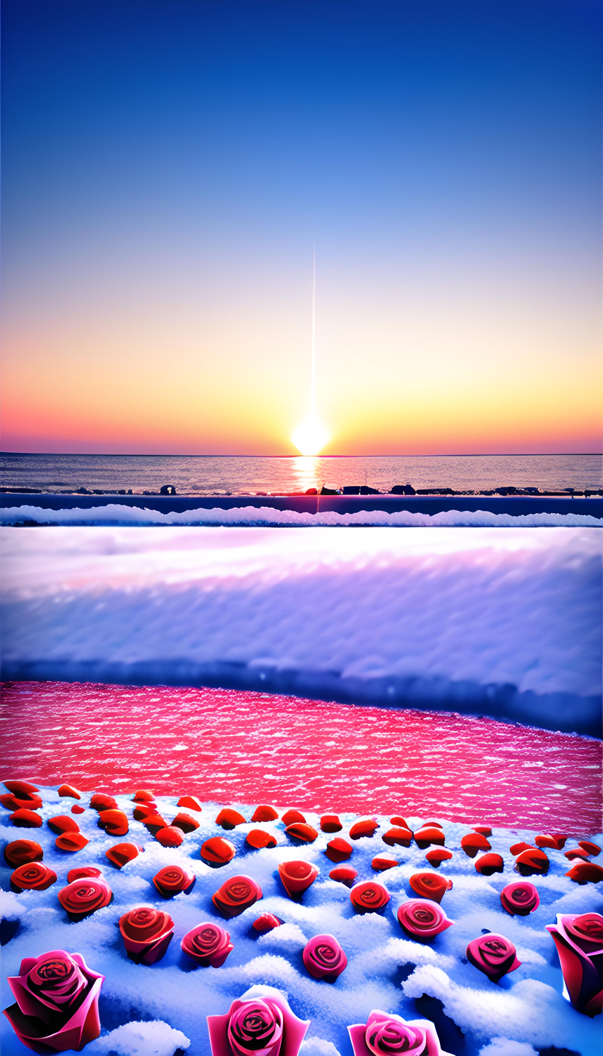 ,in the snow sea, many red roses covered with transparent snow red roses sparkling snow beach on two rows of neat snow red rose, sunset, rosy glow, sunset afterglow, new happiness, depth of field, ultra wide perspective, surrealism, ultra wide vision, ultra clear level of detail, high quality, high definition, new love rendering hd hd 2 --v 4 --ar 2:3