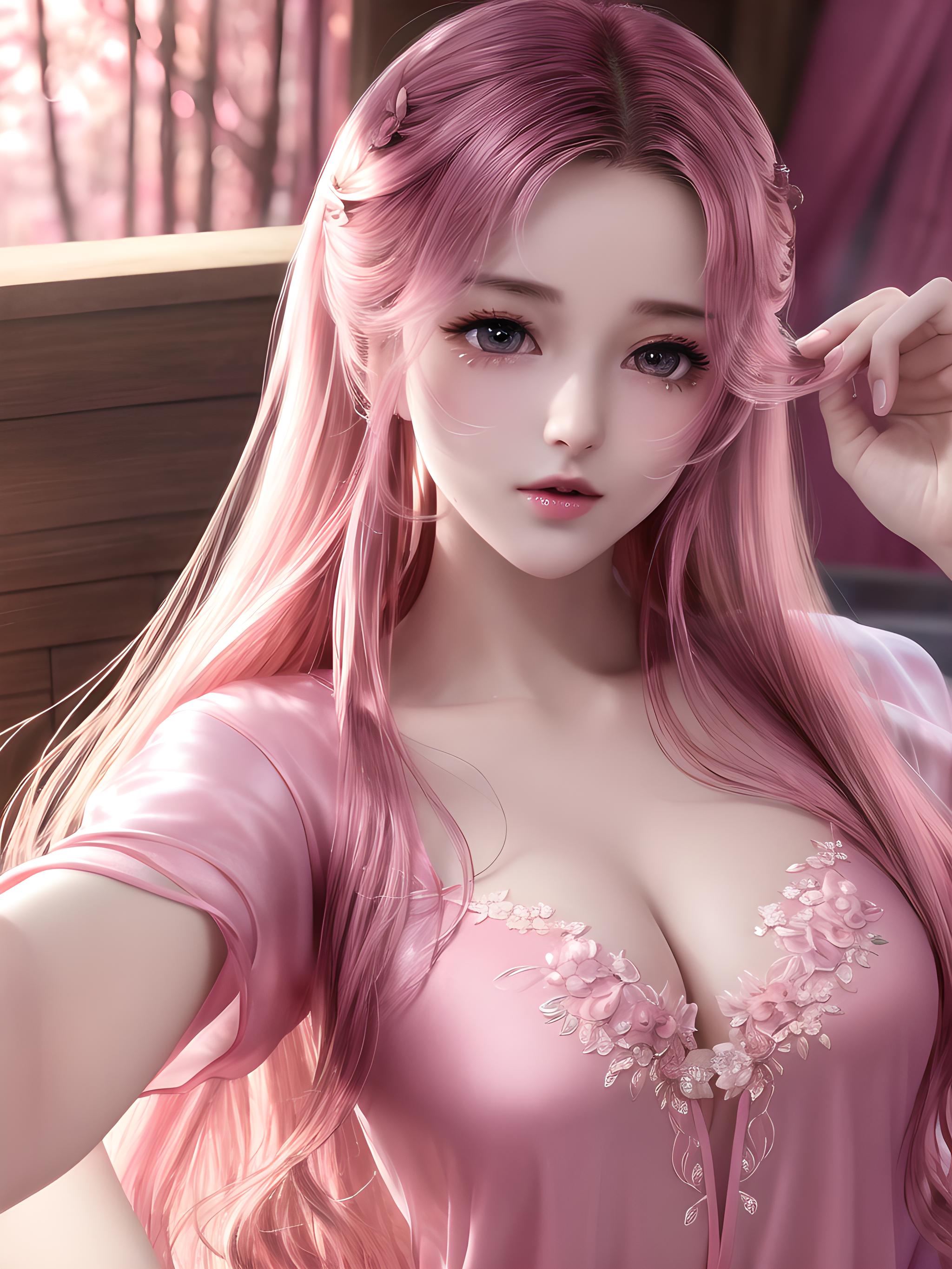 大师作品,高细节,8k分辨率,画面丰富多彩,盛开的粉色桃花,背景丰富,光影细节,极致细腻的美少女,水嫩白皙的皮肤,精致的五官,完美的脸,明亮的大眼睛,长睫毛,水嫩的嘴唇,粉色凌乱发,(透明性感丝质睡衣),极端细节,逼真细节,近摄,户外