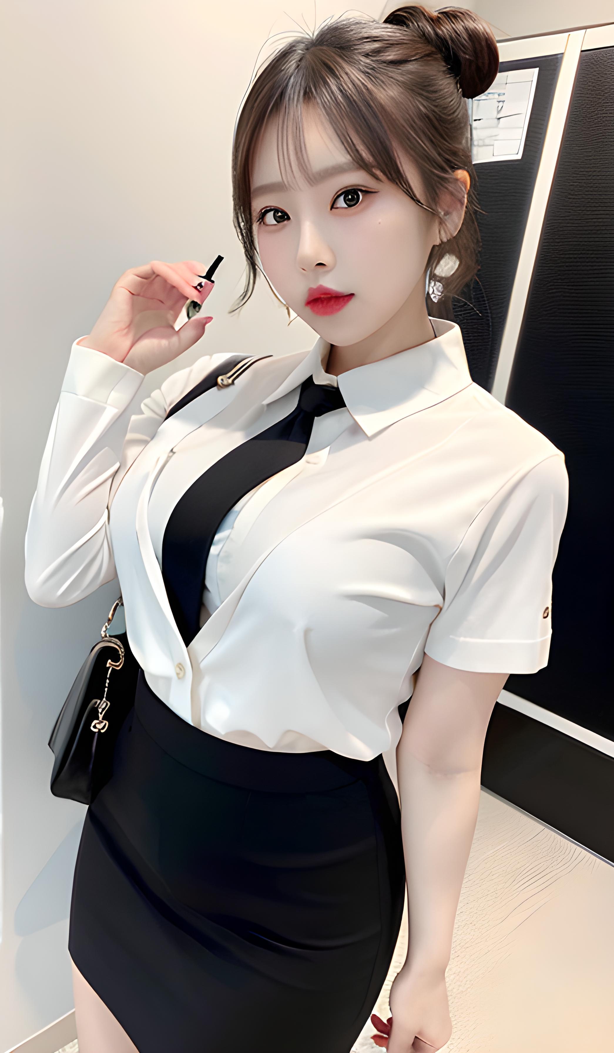 女性,职业装,短袖白衬衫,D杯,开衫, 单侧发髻 ,口红,黑色铅笔裙,长腿