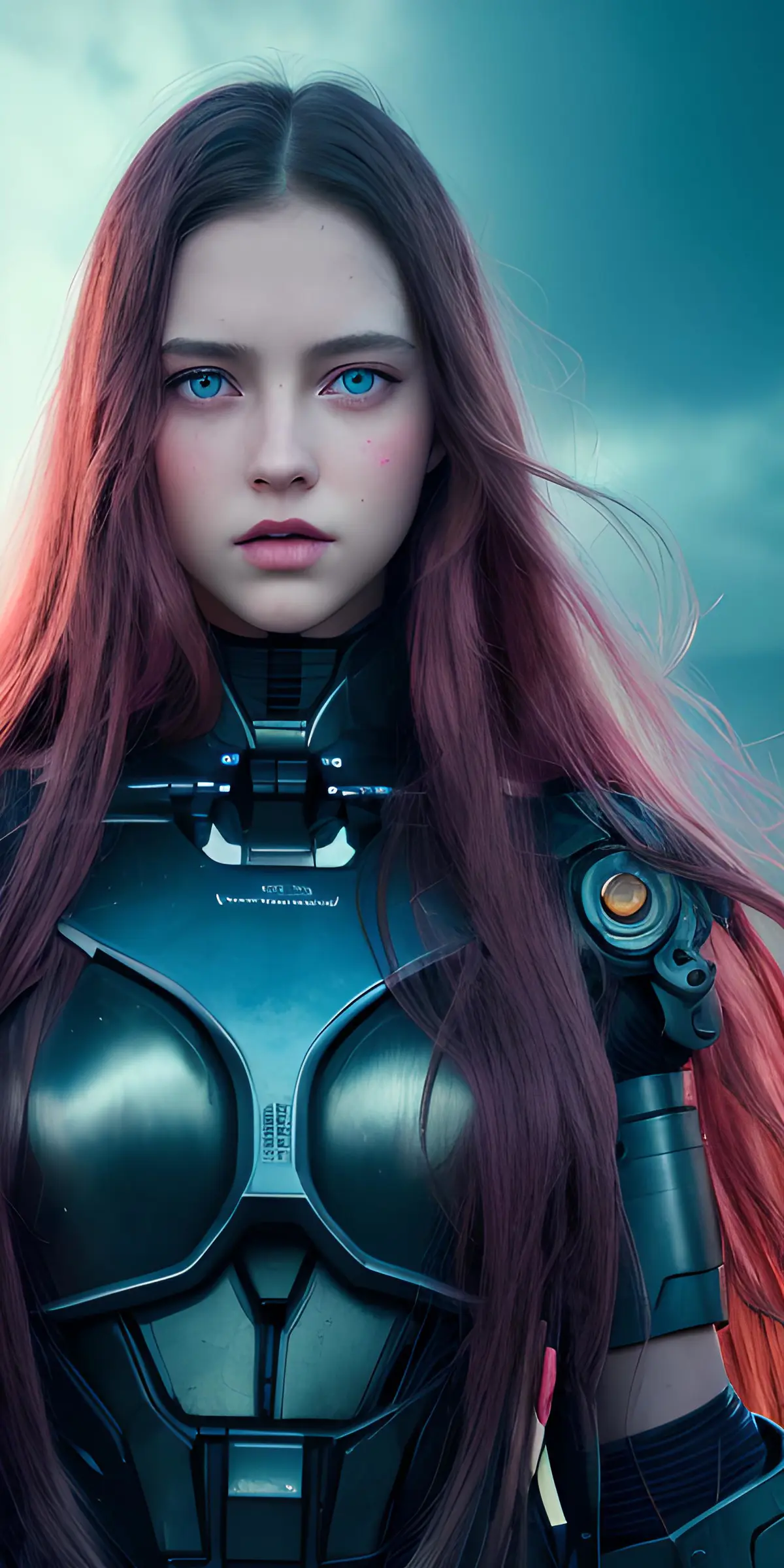 年轻的美少女,长发,粉红色双唇,红腮,阴沉的背景,精致的五官,灵动的蓝眼神,极致细节,世界末日,战争场面,支离破碎的机械躯体,机械城背景,损伤的机械手臂,超精细细节,大师作品,真实质感,电影照明真实感,完美作品,8k,高清