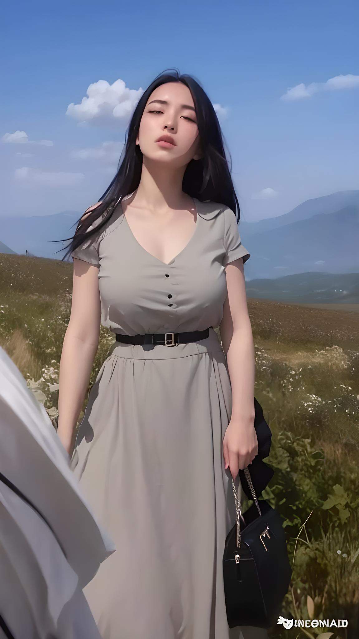 1girl,bag,black_hair,blue_sky,breasts,closed_eyes,cloud,cloudy_sky,day,dress,field,grass,holding,holding_knife,large_breasts,long_hair,mountain,outdoors,short_sleeves,sky,solo,standing,white_dress,rating:safe