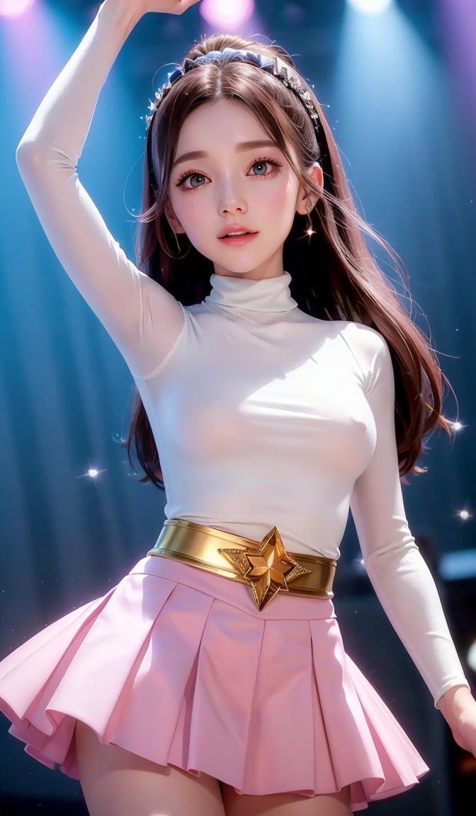 ((舞台上跳舞的美女)),舞台灯光,清晰聚焦,(技术性高细节),(白色高领毛衣,浅粉色包臀短裙),(氛围感),超高分辨率,大师作品,((粉色飘逸长发,明亮的蓝色大眼睛)),(脸部有一颗金色小星星),温柔的眼神,,微笑,史诗级,高度详细,五官精致。