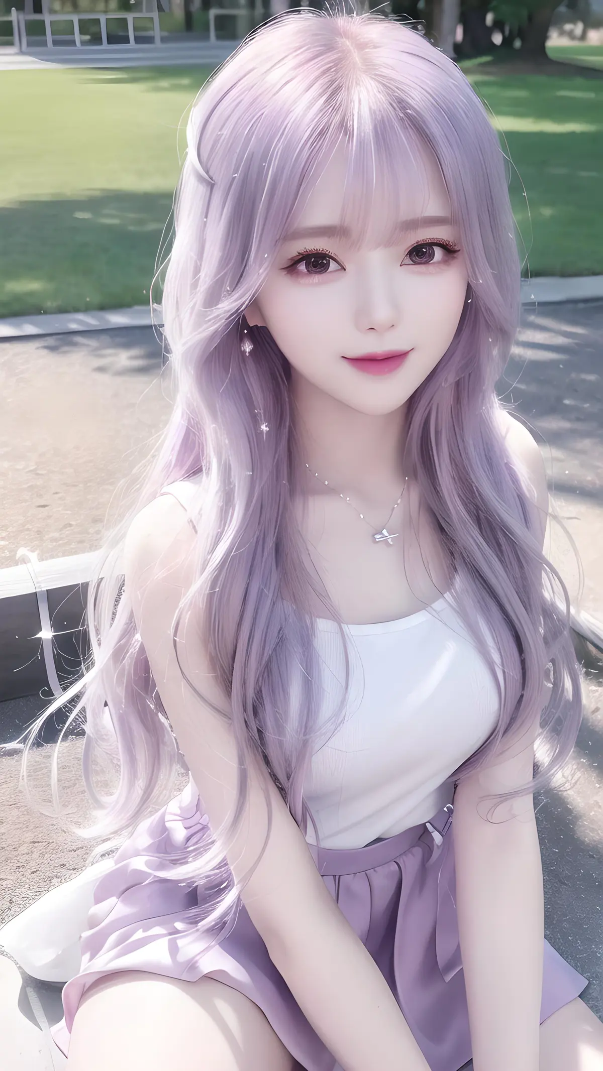 8k分辨率,可爱的脸蛋,白皙的皮肤,完美精致的五官,萝莉,超可爱,极高细节,极高质量,夜晚,灯光,腮红,粉红色裙子,凌乱发,坐在公园,白色背心,外套,纯洁的,微笑,(白粉紫色亮丽的头发)长睫毛,眼影,吊坠,油光的嘴唇,光亮的嘴唇,嘴唇特写,美瞳,清纯少女,不漏胸