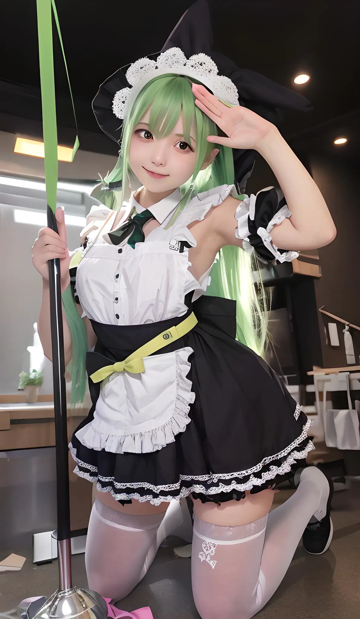 1girl,apron,arm_up,armpits,frills,green_hair,hat,kneeling,long_hair,maid,photo_(medium),skirt,smile,solo,thighhighs,white_legwear,zettai_ryouiki,hatsune_miku,rating:safe