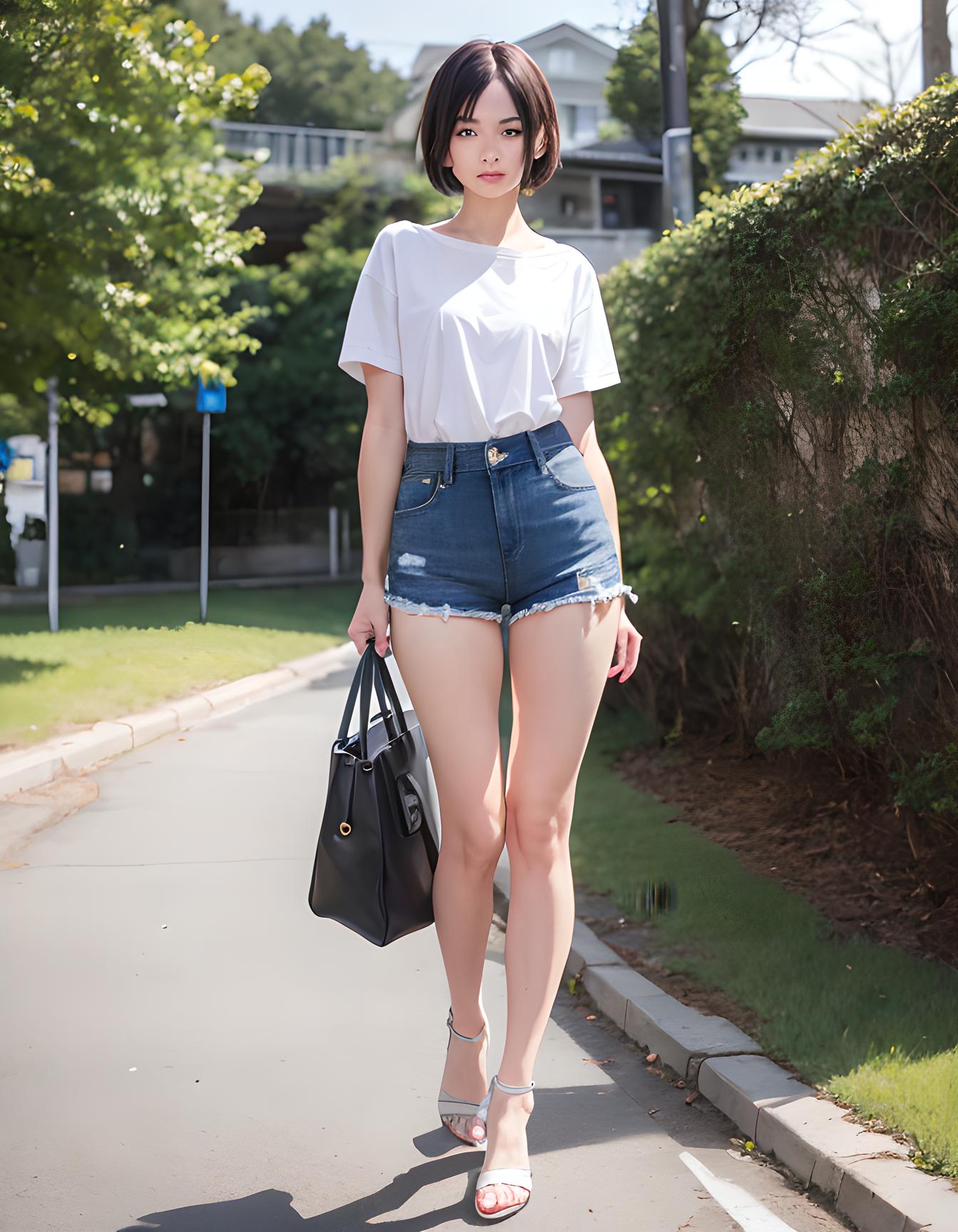 1girl,bag,bangs,bare_legs,beach,blue_shorts,blue_sky,breasts,brown_eyes,brown_hair,bush,cloud,cutoffs,dappled_sunlight,day,denim,denim_shorts,foliage,forest,full_body,grass,handbag,hill,holding,holding_bag,jewelry,looking_at_viewer,mountain,nature,outdoors,park,path,plant,realistic,river,road,sandals,school_bag,see-through,shirt,shirt_tucked_in,shoes,short_hair,short_shorts,short_sleeves,shorts,shoulder_bag,sky,solo,standing,street,sunlight,tree,tree_shade,walking,white_footwear,white_shirt,rating:safe