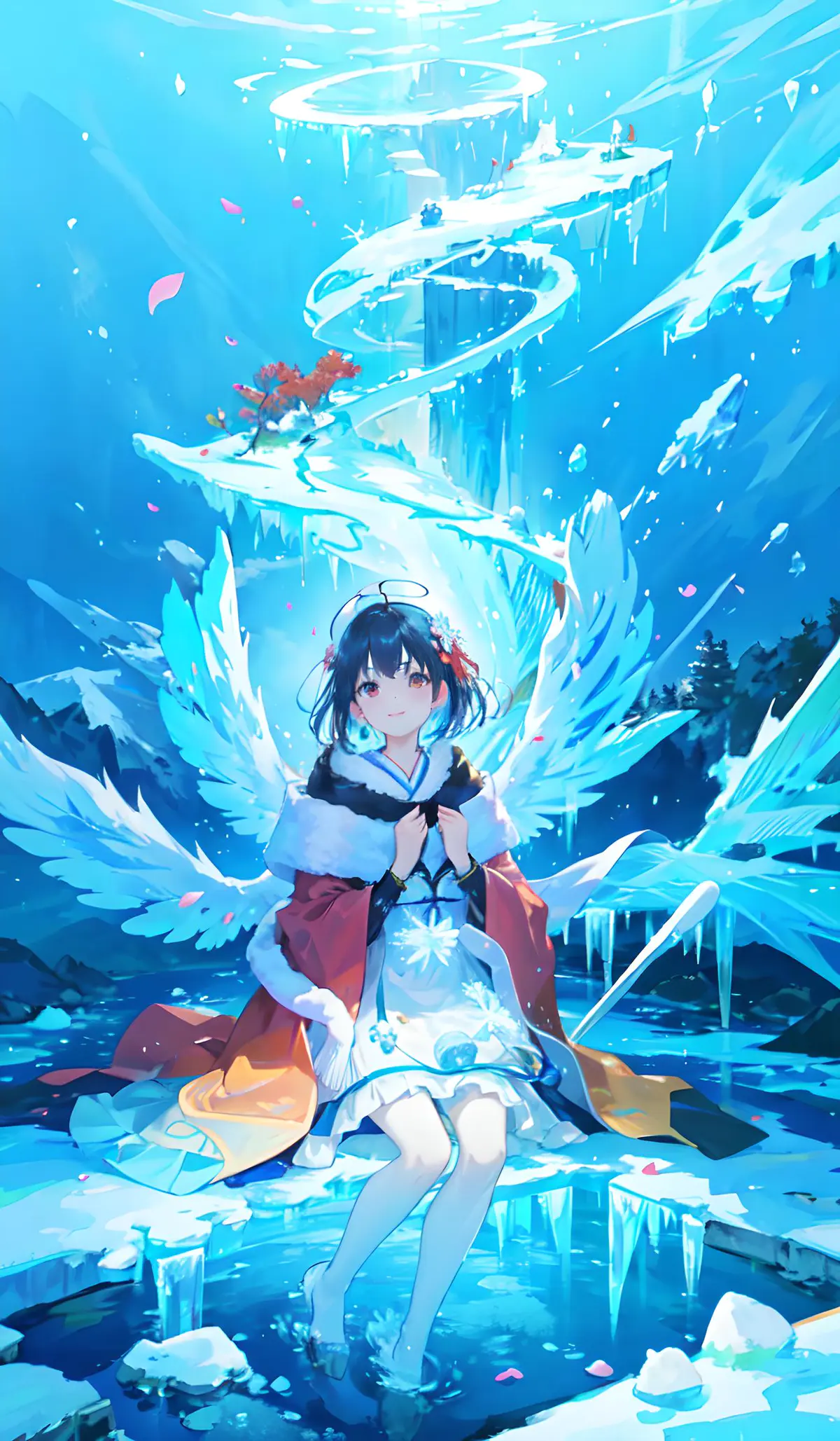 大师作品,更高质量,女孩,闪闪发光瞳,微笑,中发,羽翼,冬天,星星,冰雪,魔法环,新艺术主义,星之彩,冰魔法
