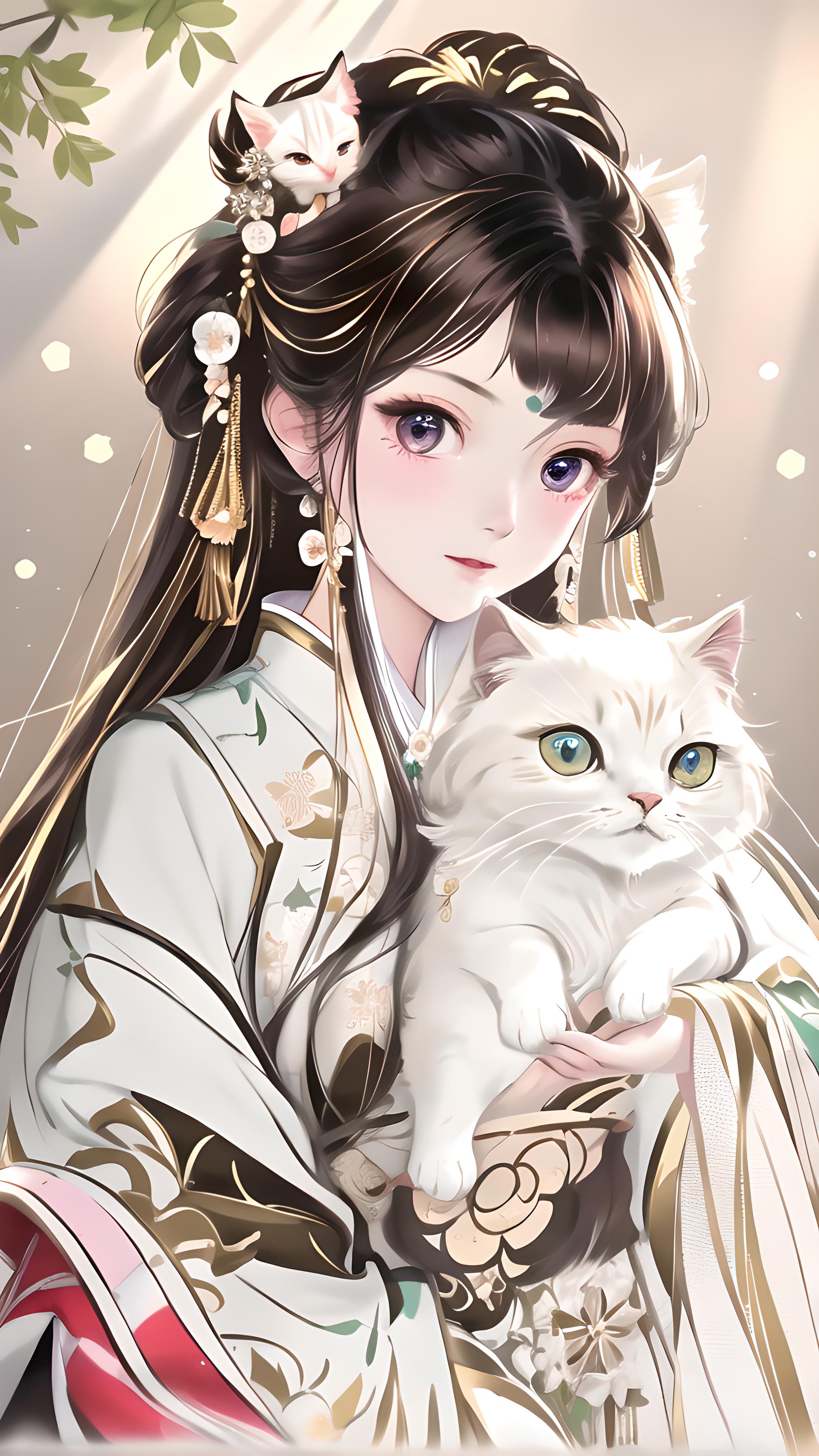抱着白猫的汉服少女