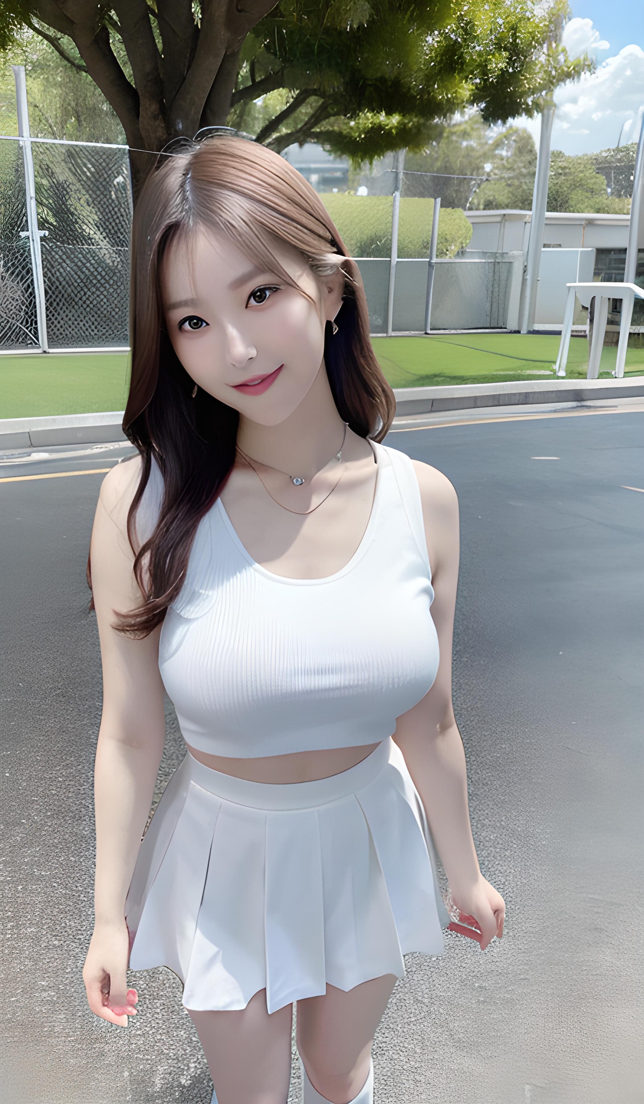 大师作品,超高清分辨率,8k分辨率,远景,全身照,第一视角,亚洲面孔,御姐,五官端正,(短发),水汪汪大眼睛,白皮肤,身材高挑,皮肤白皙,清纯优雅,远景,(面向观者),俏嘴唇,眉清目秀,表情可爱,微笑着,3a,天生丽质,脸红扑扑,脖子戴项链,,锁骨,圆领,胸部中等饱满,腰围,臀部丰满,腿修长,穿白色运动鞋,白色过膝袜(穿JK短裙), 戴白色棒球帽,蓝天白云,,站在操场上,开心的笑,