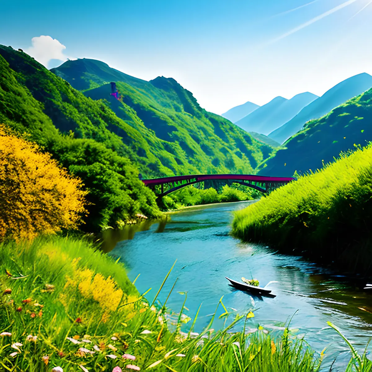 阳光明媚,一叶扁舟顺水而行,远处钢铁桥梁横担两山之间,山上植被郁郁葱葱,自是美好