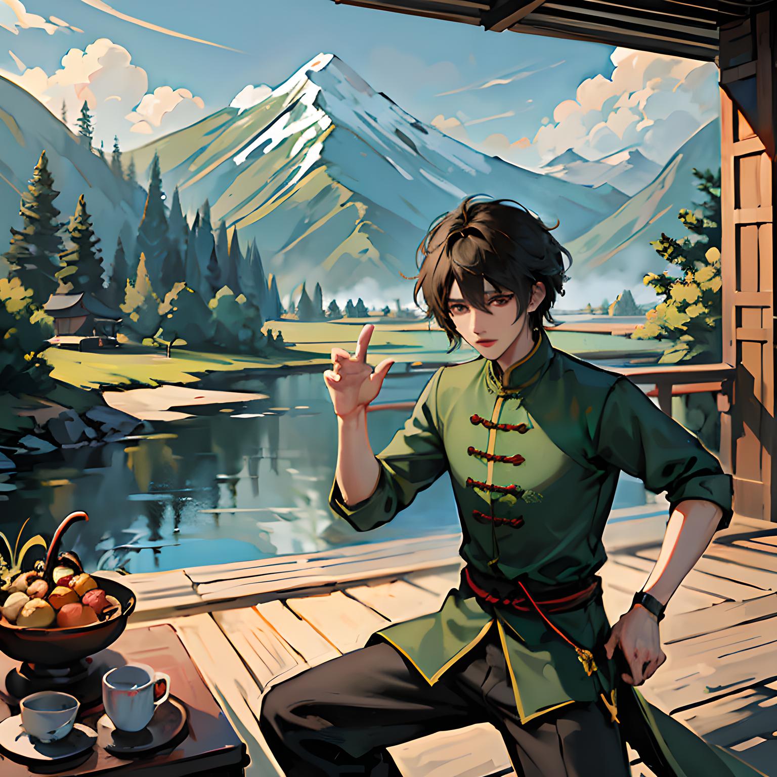 呈现令狐冲潇洒仗剑的形象,高质量,近景,(武侠小说题材), 镜头强调令狐冲的面部,(男),(明朝时期),(江湖风),逆光拍摄画面,(经典动作), 镜头追随令狐冲,(人物细节), 背景为(山林河流),墨绿色调,模糊背景突出人物形象,(借鉴金庸作品插画艺术风格)。