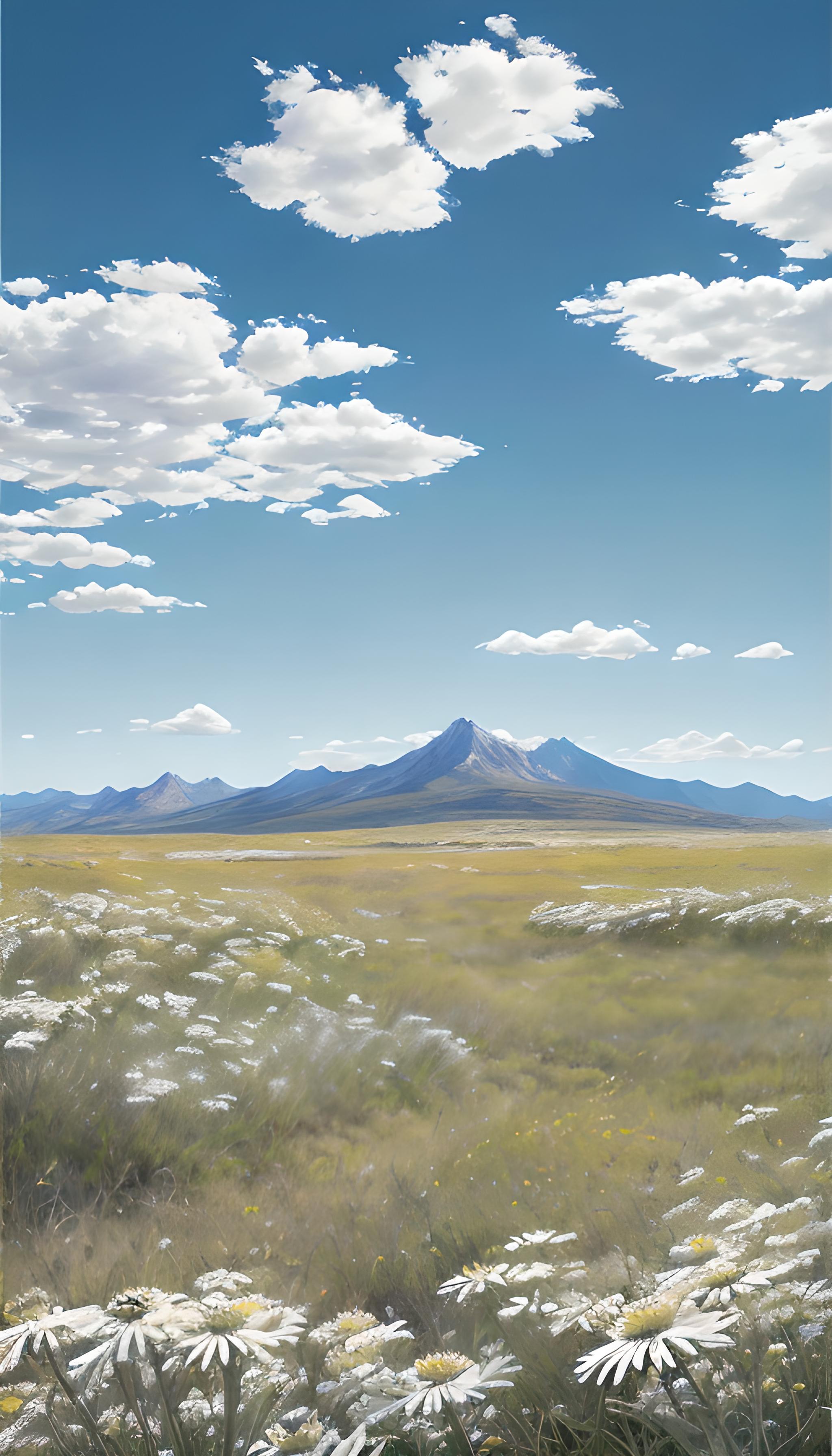 8 真实风景, 蓝天白云, 一望无际的大草原, 地上满地的野菊花, 远山, 非常多的细节, 天空主体取景, 最佳画质, 超高清, 中景, 大 光圈