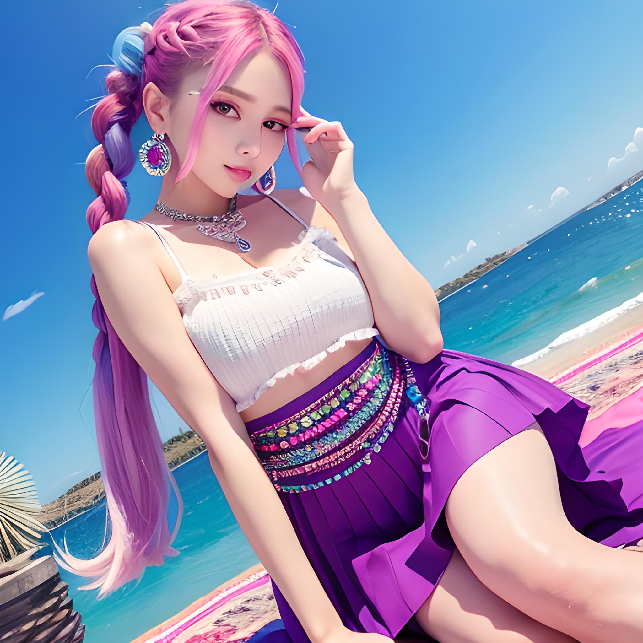 一个稚嫩可爱的少女,清凉上衣,开衩百褶裙,水晶高跟鞋,五颜六色,夏天,彩虹色亮光长发,麻花辫子,宝石耳环,水晶项链,彩色清澈眼眸,头戴五颜六色的花,(顺滑的头发,精致完美的五官最美的大眼睛,长长的睫毛,眼睛甜...查看更多