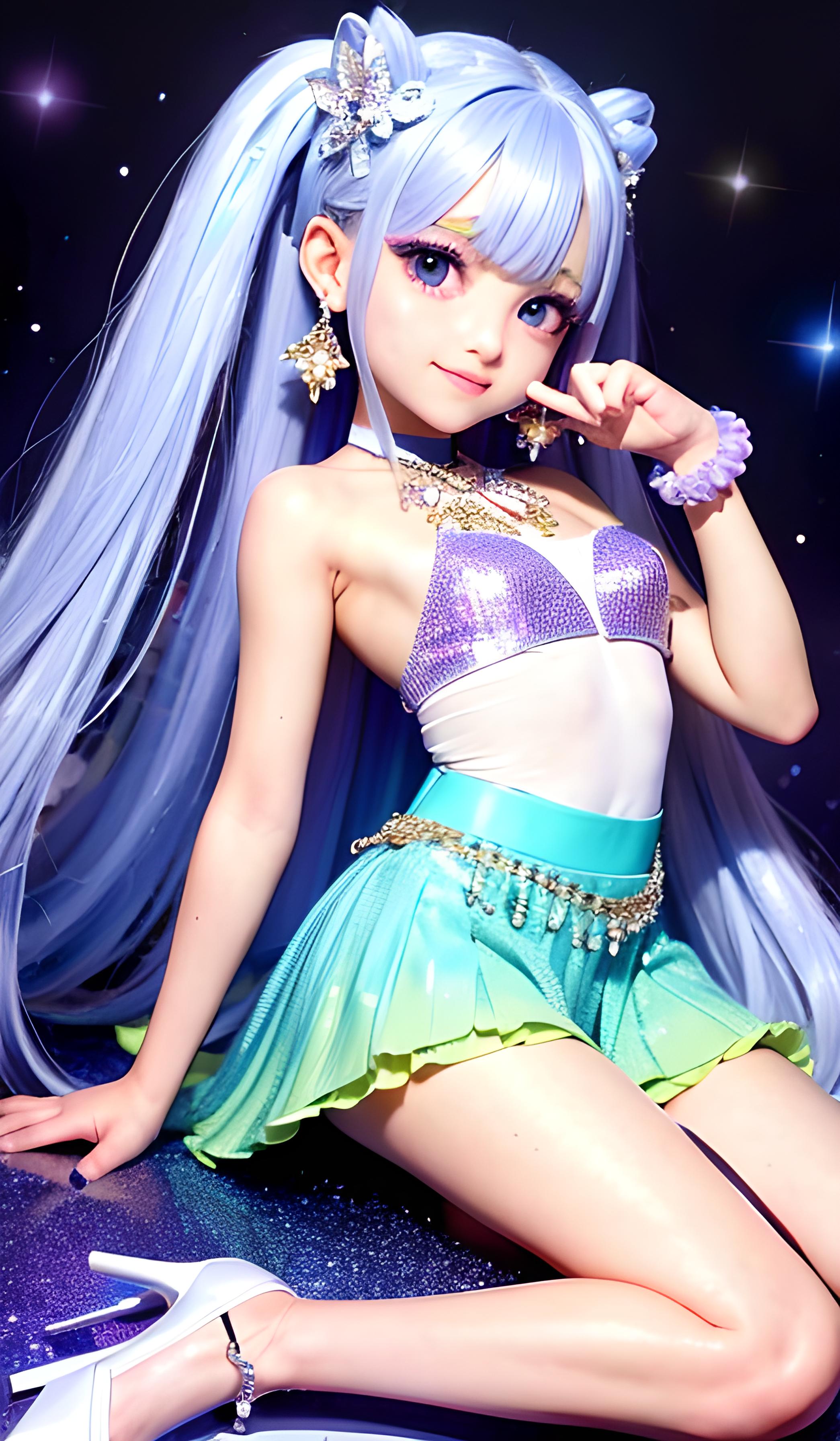 一个稚嫩可爱的少女,清凉上衣,开衩百褶裙,水晶高跟鞋,五颜六色,夏天,彩虹色亮光长发,麻花辫子,宝石耳环,水晶项链,彩色清澈眼眸,头戴五颜六色的花,(顺滑的头发,精致完美的五官最美的大眼睛,长长的睫毛,眼睛甜美有卧蚕,微笑),精确完美的人体结构,面向镜头