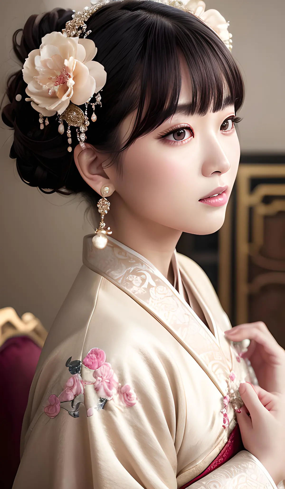 大师作品,最好画质,最好的质量,高细节,8k分辨率,景深,汉朝风格美女,绝色美人,松散发髻,复杂精致的发髻,娘娘发髻,黑发,蓬松,精致的步摇,牡丹花头饰,大花朵,亮晶晶的发饰,黑白分明的瞳孔,脸上有红晕,精致的耳环,完美精致的淡装,浅色的汉服,刺绣牡丹花,精致的五官细节刻画,中国风,古风娘娘,浅色唯美背景,古风背景,画面背景,精致的细节刻画,增强立体的五官,疯狂的细节,迷人