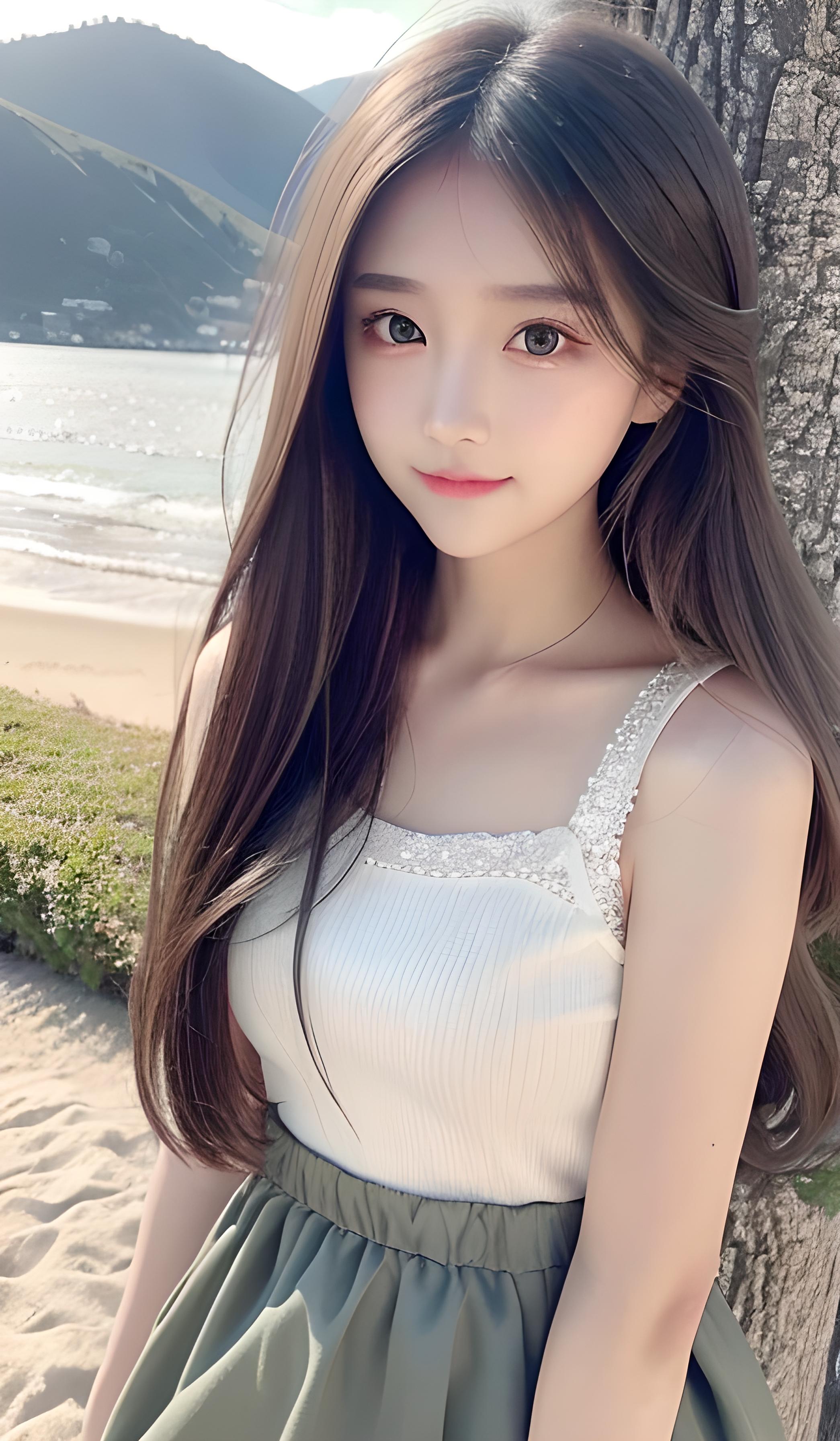 一个漂亮可爱的长发女孩,小萝莉,最高画质,精美画面,丁达尔效应,大眼睛,长睫毛,灰色头发,绿色裙子,完美五官,清晰脸庞,精致嘴唇,微笑,干净唯美的背景,温柔的光线,简单化,人物居中,海边背景